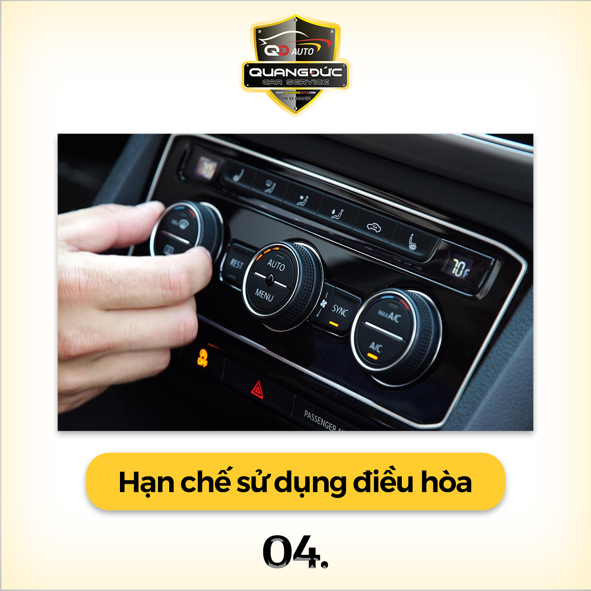 Nếu như thời tiết dễ chịu, người sử dụng nên tắt điều hòa. Việc này sẽ giúp tiết kiệm được năng lượng cho xe. Điều hoà không khí có thể tiêu tốn 10% nhiên liệu. Tuy nhiên, ở tốc độ trên 80km/h sử dụng điều hoà không khí tốt hơn cho việc mở một cửa sổ. Một cách nữa đó là bạn sử dụng phim cách nhiệt để làm cho nhiệt độ vào trong xe thông qua đường cửa kính được giảm bớt, khi đó thì máy lạnh bạn sẽ sử dụng ở mức cao hơn nên cũng sẽ tiết kiệm nhiên liệu hơn.