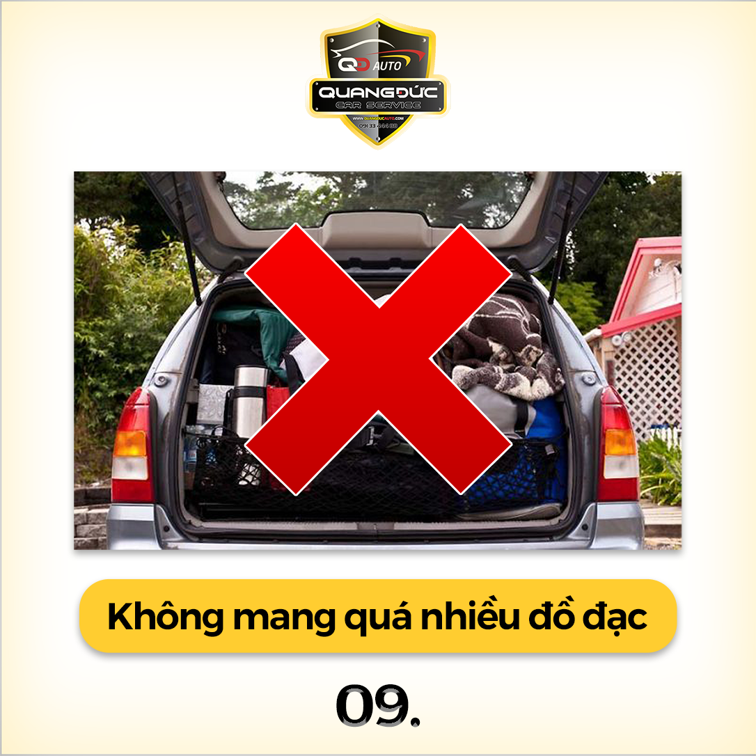 Nếu không cần thiết trong hành trình không nên mang nhiều đồ đạc, chỉ mang theo những thứ cần thiết. Những thứ không cần thiết không nên đưa lên xe. Bởi vì, cứ 50kg hành lý sẽ tiêu tốn thêm 2% nhiên liệu và gây lãng phí nhiên liệu một cách không cần thiết.