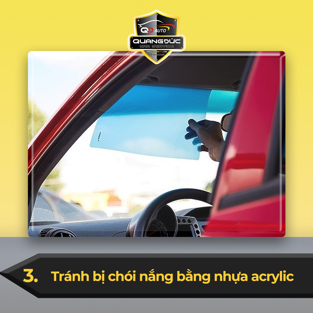 Mẹo này thường được phi công sử dụng. Để không bị chói mắt dưới ánh sáng mặt trời, đặt một miếng nhựa acrylic trong trên tấm chống nắng. Miếng acrylic rất dễ bám trên tấm chống nắng nhờ lực tĩnh điện và nó giúp bảo vệ mắt ta khỏi tia cực tím khá hiệu quả.