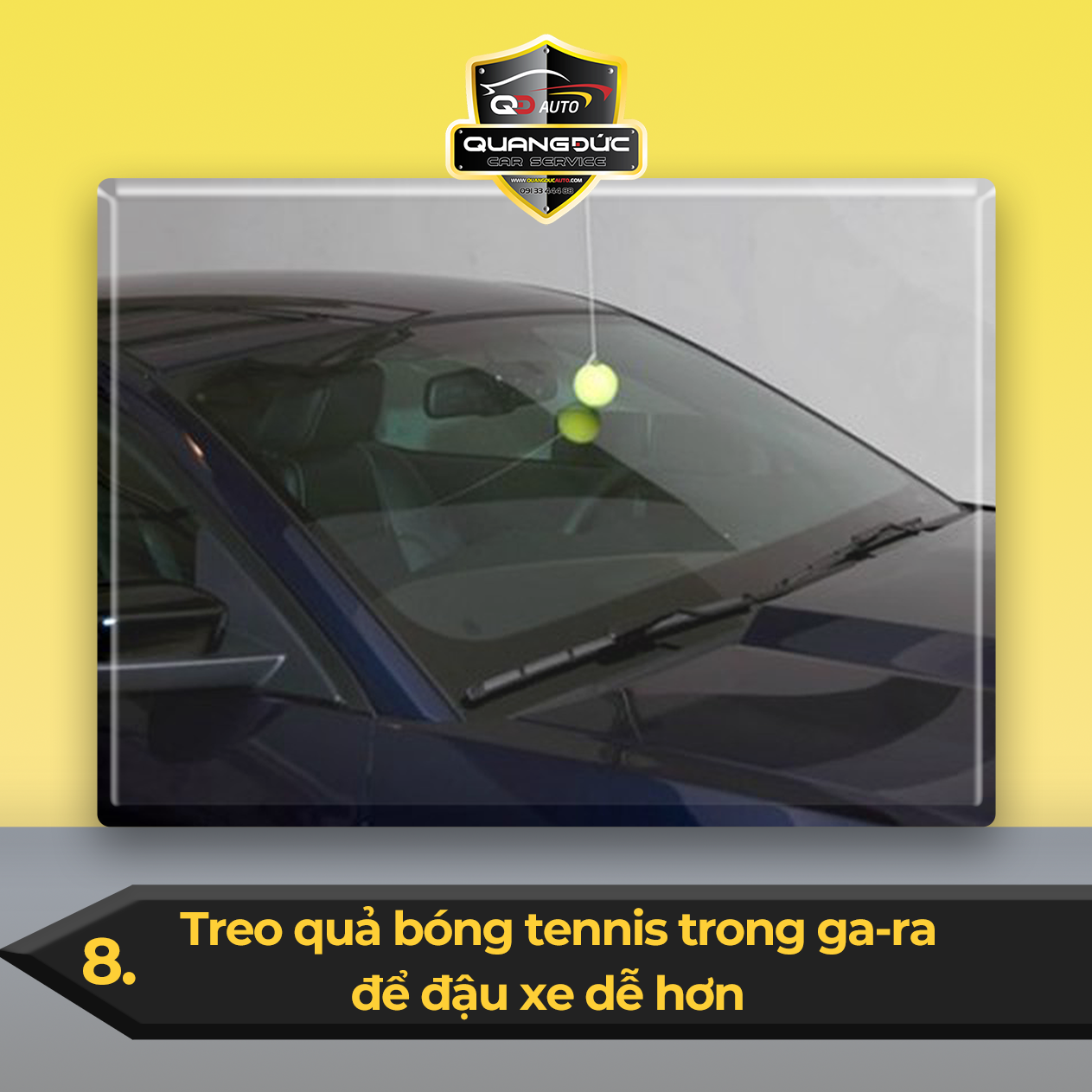Mẹo này đặc biệt hữu ích với những người mới lái xe. Quả bóng tennis treo trong ga-ra giống như một dấu hiệu thông báo sắp đến bức tường. Quả bóng sẽ giúp ta cảm nhận được kích thước của xe. Từ đó, ta không lái vượt vị trí đậu xe trong ga-ra.