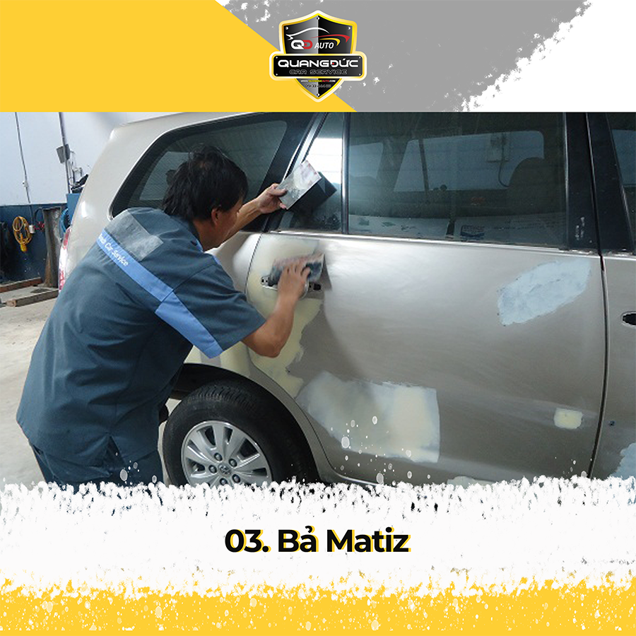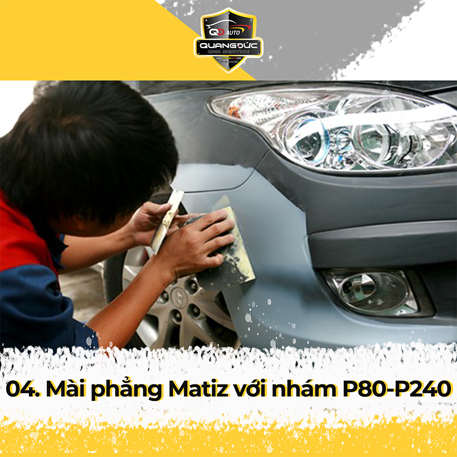Sử dụng máy mài lắp giấy ráp có độ sần thích hợp để loại bỏ lớp sơn cũ của những vùng cần sơn giúp Sơn lót và Ma tít có thể bám dính tốt nhất. Nếu có những vùng bị móp méo, vết lõm sâu chúng tôi sẽ gò lại bằng máy hàn rút tôn tạo bề mặt phẳng tương đối theo form xe ban đầu của nhà sản xuất.