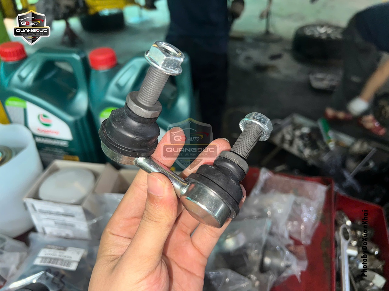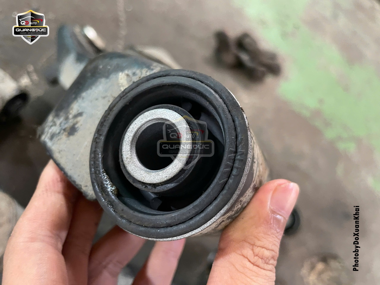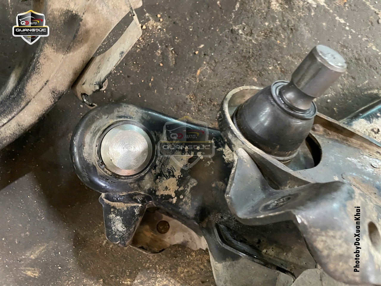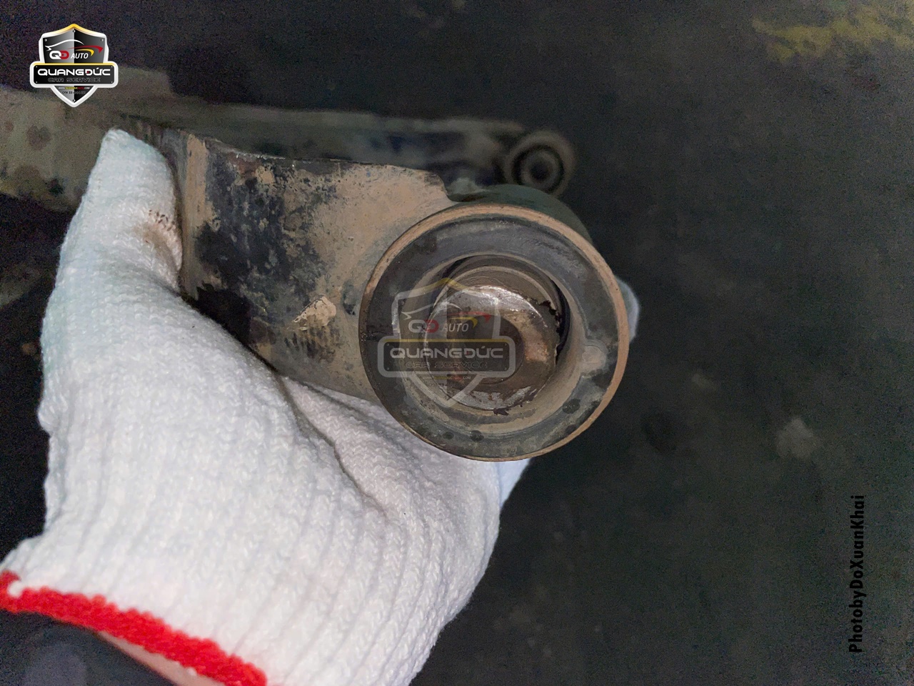 Sau khi kiểm tra, đội ngũ kỹ thuật của Quang Đức Auto đã nhận thấy Cao su càng A dưới ( To, nhỏ) bị nứt, mòn do oxi hóa, Rotuyn cân bằng bị bụi bẩn bám vào sâu bên trong gây bó kẹt do đó cần thay thế các chi tiết này.
