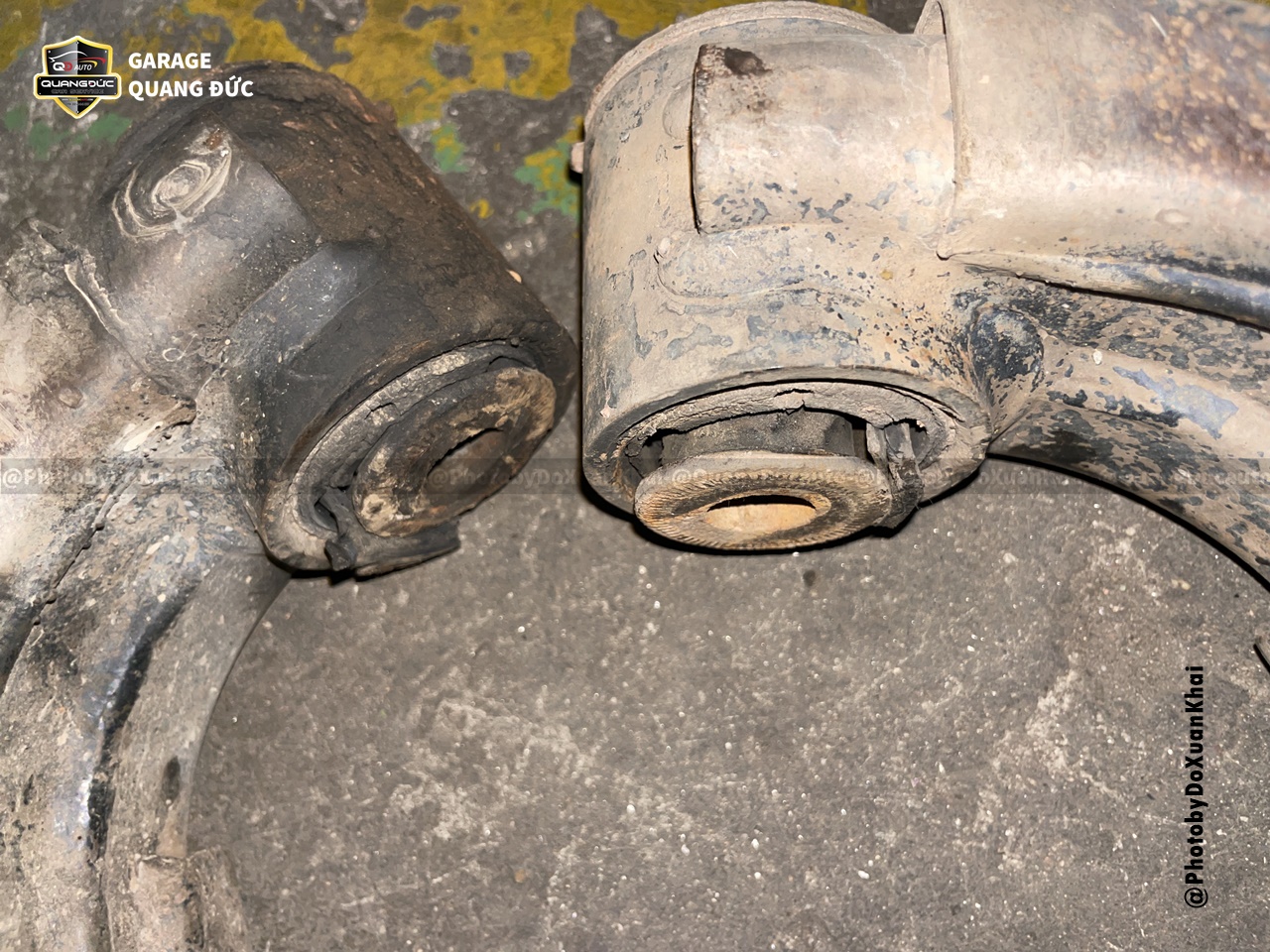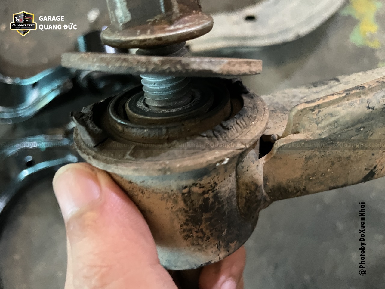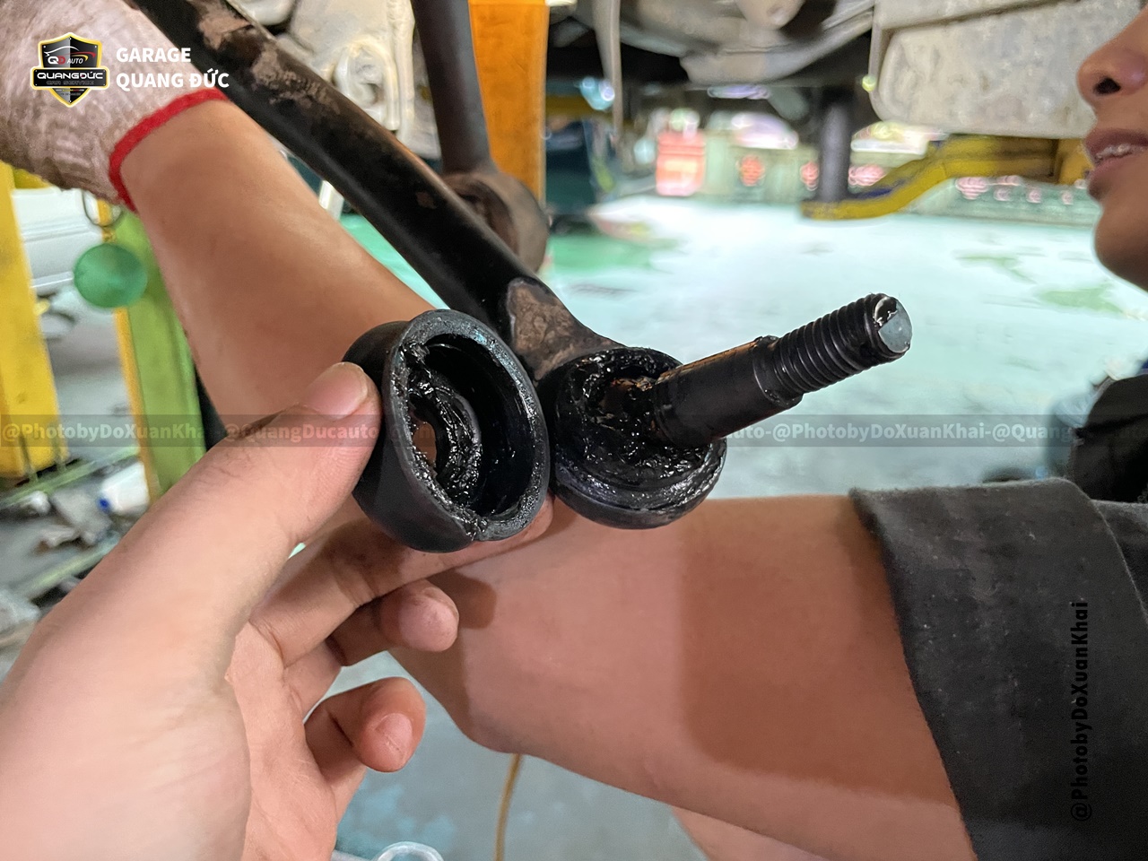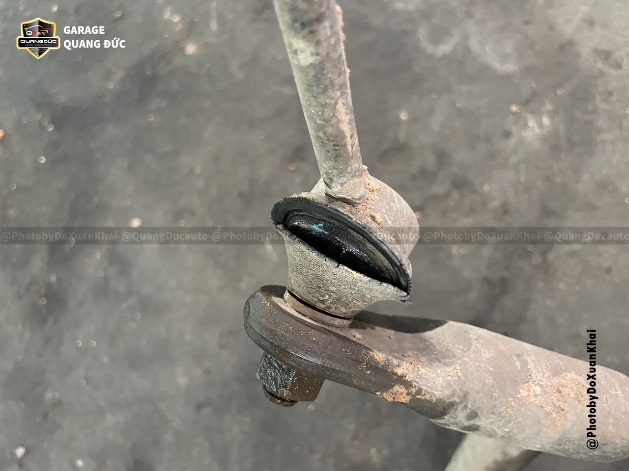 Sau khi kiểm tra, đội ngũ kỹ thuật của Quang Đức Auto đã nhận thấy Cao su càng A dưới ( To, nhỏ) bị nứt, mòn do oxi hóa, Rotuyn cân bằng bị bụi bẩn bám vào sâu bên trong gây bó kẹt do đó cần thay thế các chi tiết này.