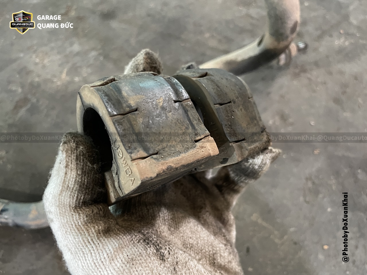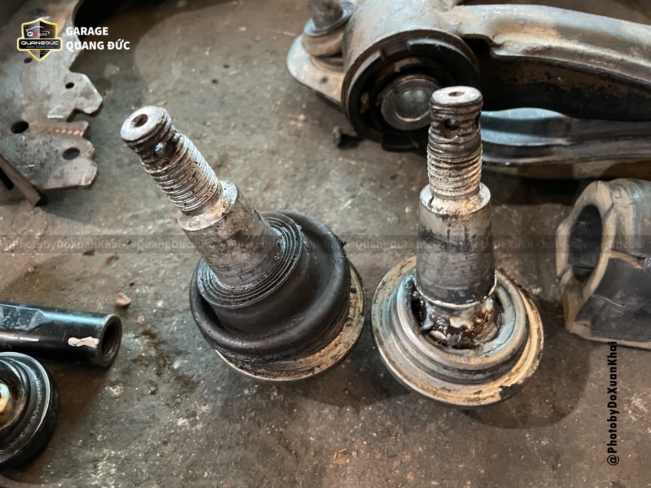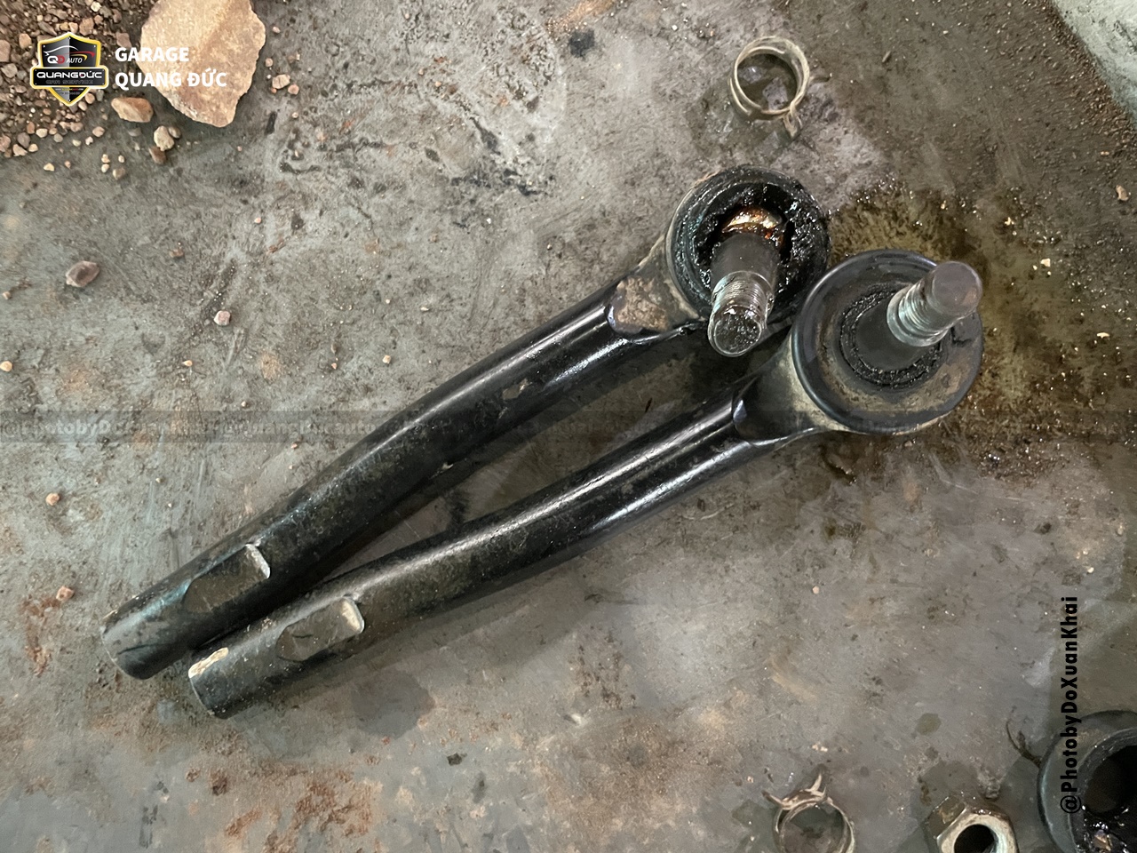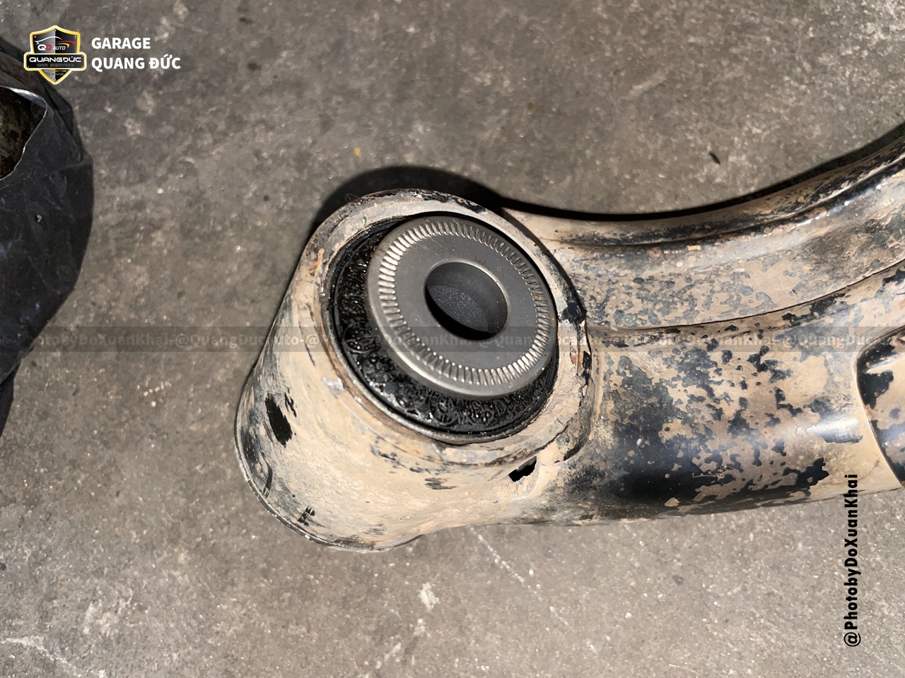 Sau khi kiểm tra, đội ngũ kỹ thuật của Quang Đức Auto đã nhận thấy Cao su càng A dưới ( To, nhỏ) bị nứt, mòn do oxi hóa, Rotuyn cân bằng bị bụi bẩn bám vào sâu bên trong gây bó kẹt do đó cần thay thế các chi tiết này.
