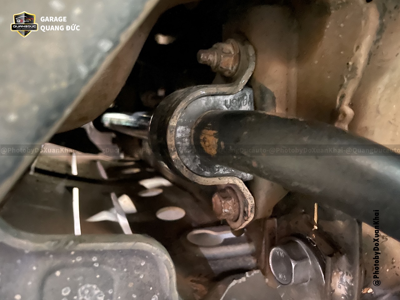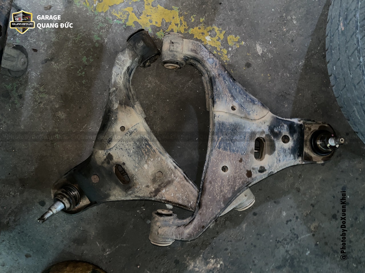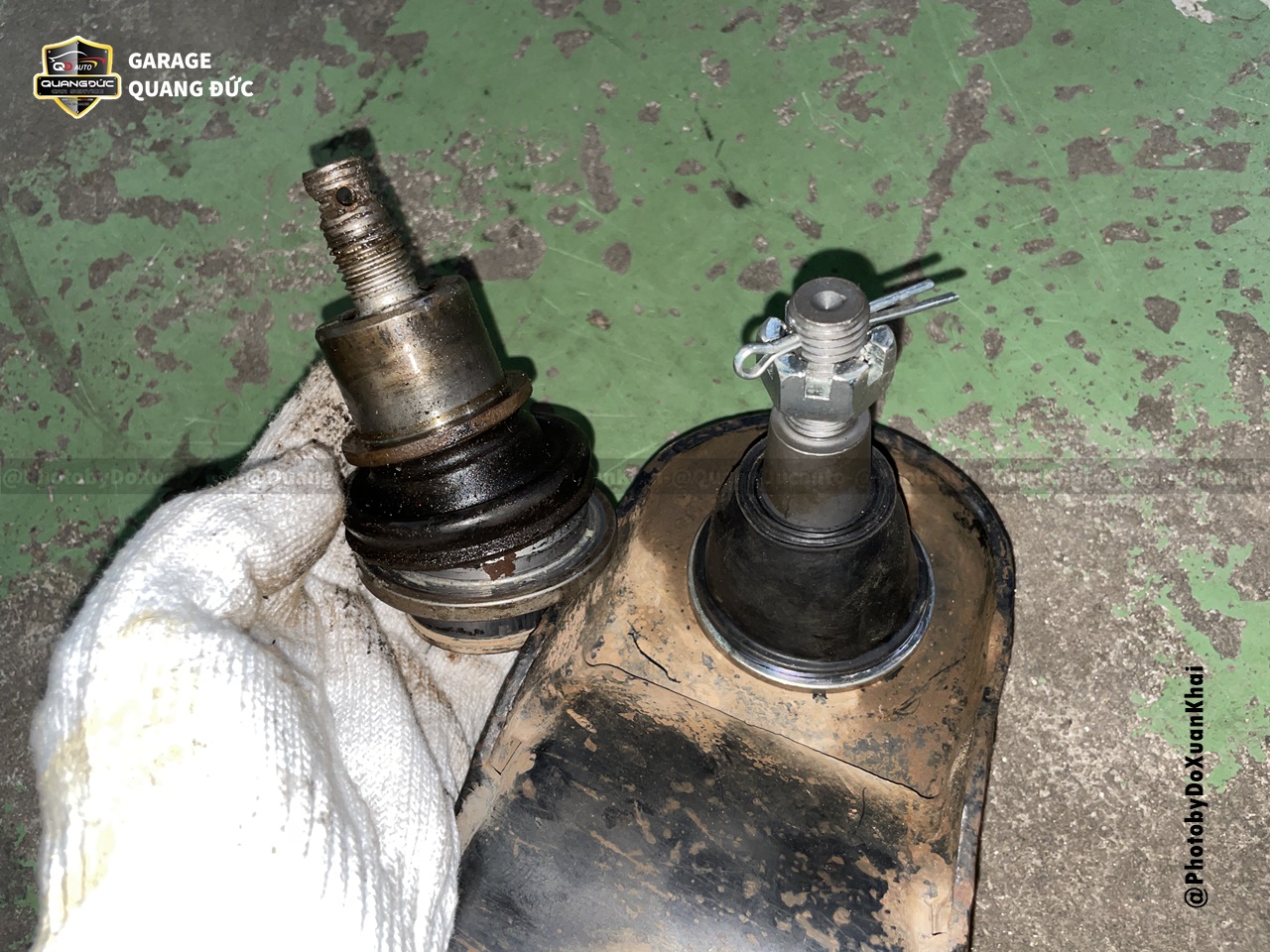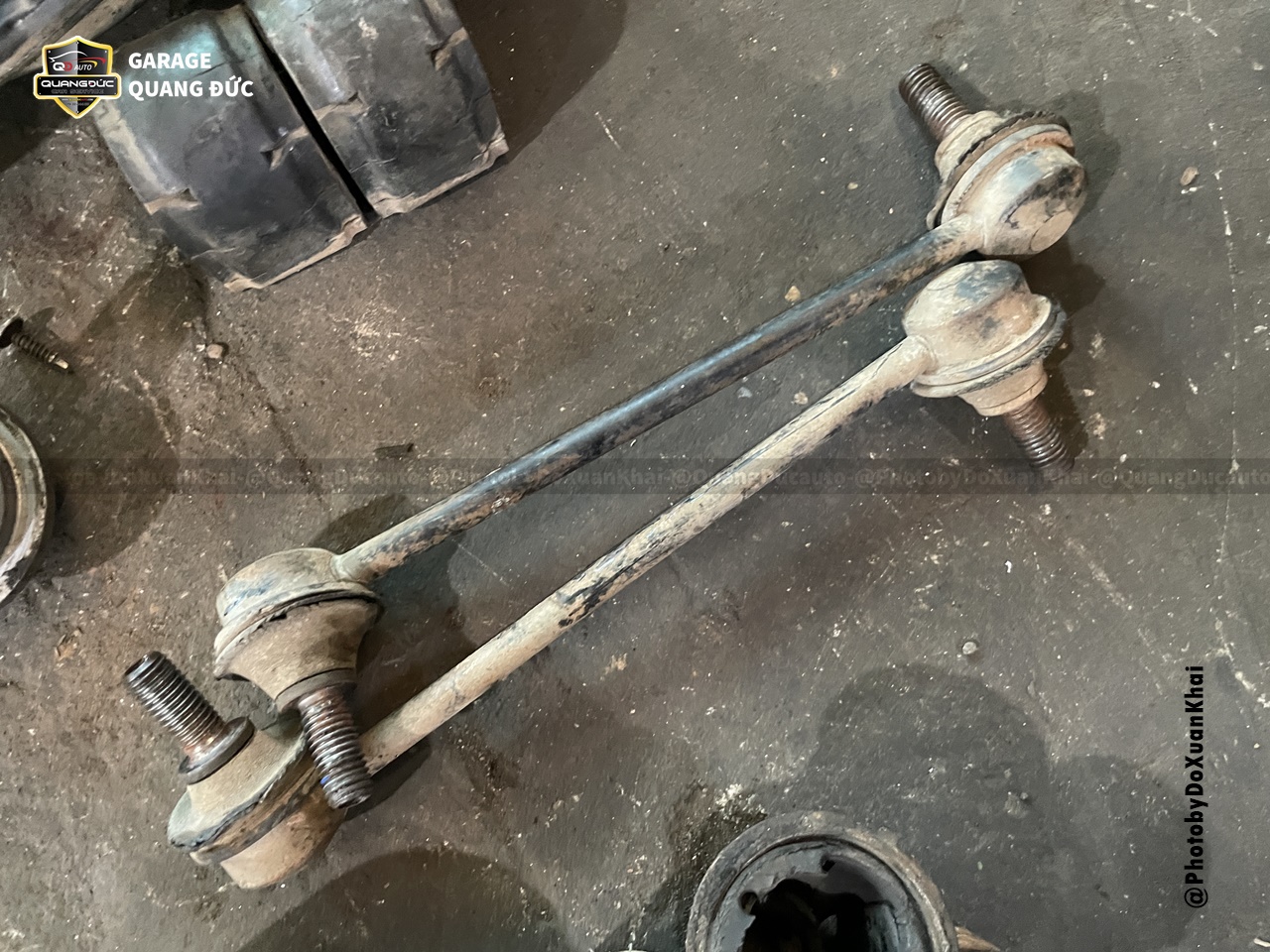Sau khi kiểm tra, đội ngũ kỹ thuật của Quang Đức Auto đã nhận thấy Cao su càng A dưới ( To, nhỏ) bị nứt, mòn do oxi hóa, Rotuyn cân bằng bị bụi bẩn bám vào sâu bên trong gây bó kẹt do đó cần thay thế các chi tiết này.