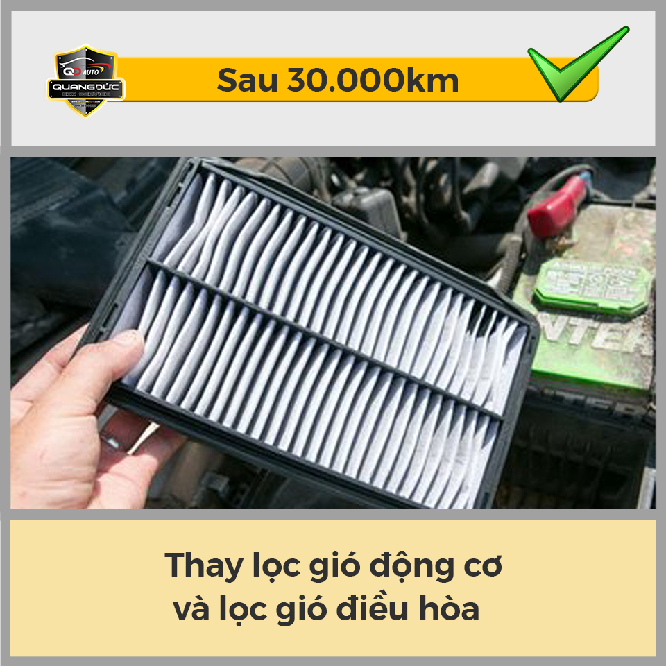 Sau mỗi 30.000 km, chiếc lọc gió động cơ và lọc gió điều hòa sẽ dơ và nghẹt, ảnh hưởng đến hoạt động của động cơ và sức khỏe của bạn. Bạn cần thay lọc gió động cơ và lọc gió điều hòa định kỳ sau 30.000 km để động cơ làm việc êm ái và tiết kiệm nhiên liệu hơn đồng thời giúp hệ thống điều hòa hoạt động tốt và bảo vệ sức khỏe của bạn.