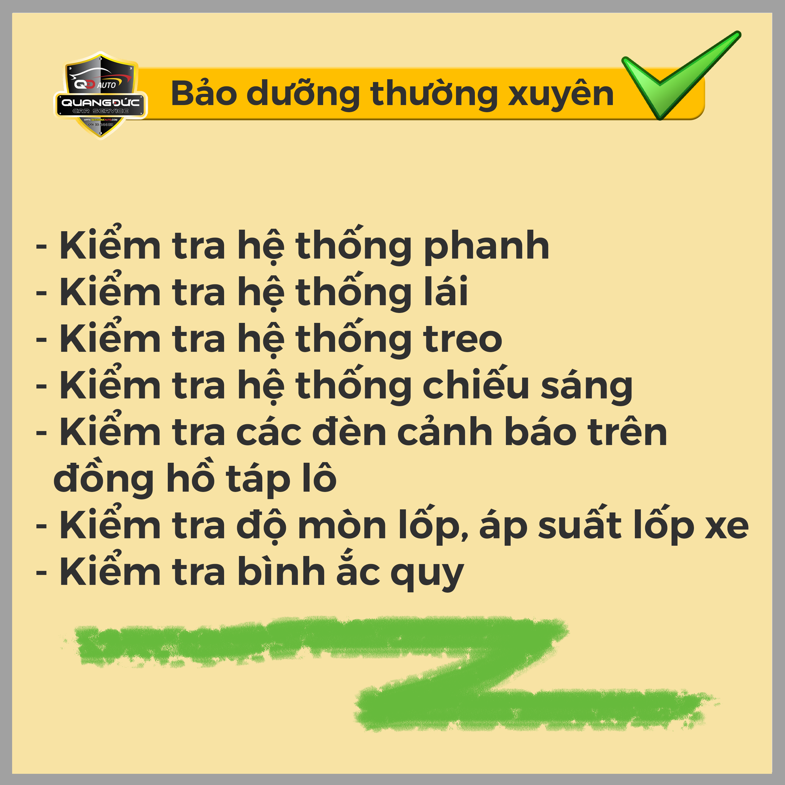 Ngoài những hạng mục kiểm tra định kỳ, còn có những những bộ phận, hệ thống trên xe mà bạn cần kiểm tra thường xuyên hoặc kiểm tra mỗi khi sử dụng xe để đảm bảo chiếc xe luôn trong tình trạng tốt nhất. Các bộ phận cần kiểm tra thường xuyên bao gồm