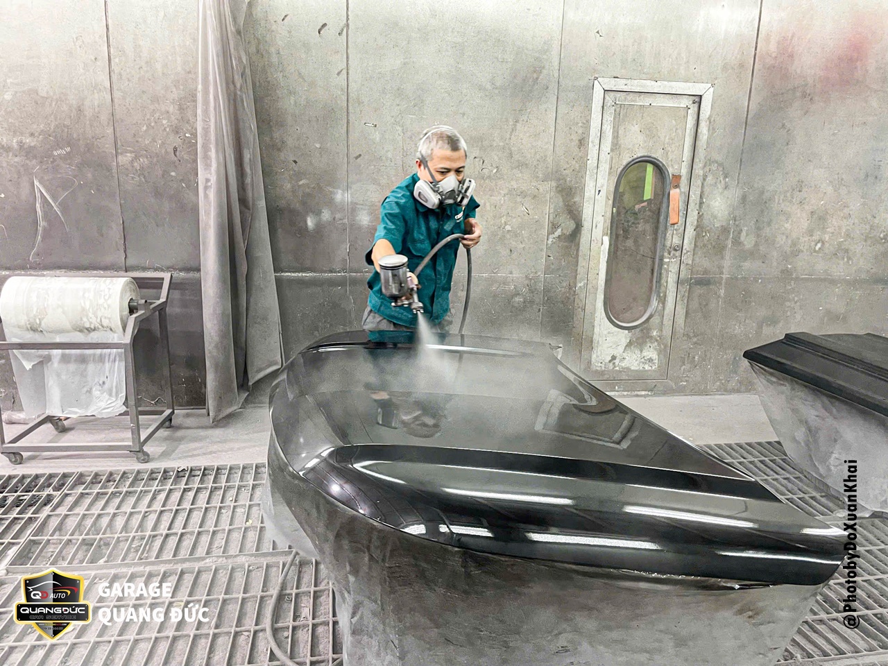 Bước 5: Phun sơn và sấy khô lần lượt với các lớp như bả matit, lớp sơn lót, sơn màu. Cuối cùng là phun sơn bóng và hoàn thiện.