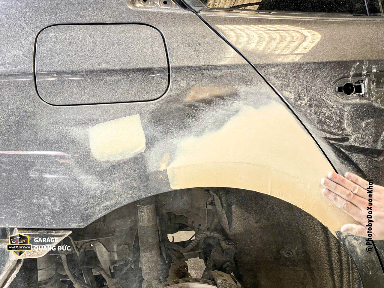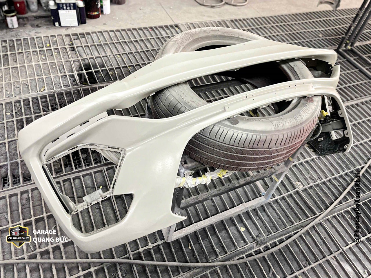 Bước 4: Sơn lớp lót chống rỉ, tiến hành pha màu sơn RM theo đúng tỷ lệ tiêu chuẩn của màu xám Porsche không nhũ, Phun sơn màu, sơn phủ bóng
