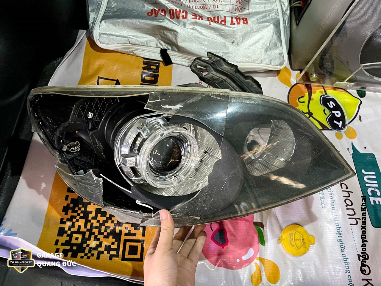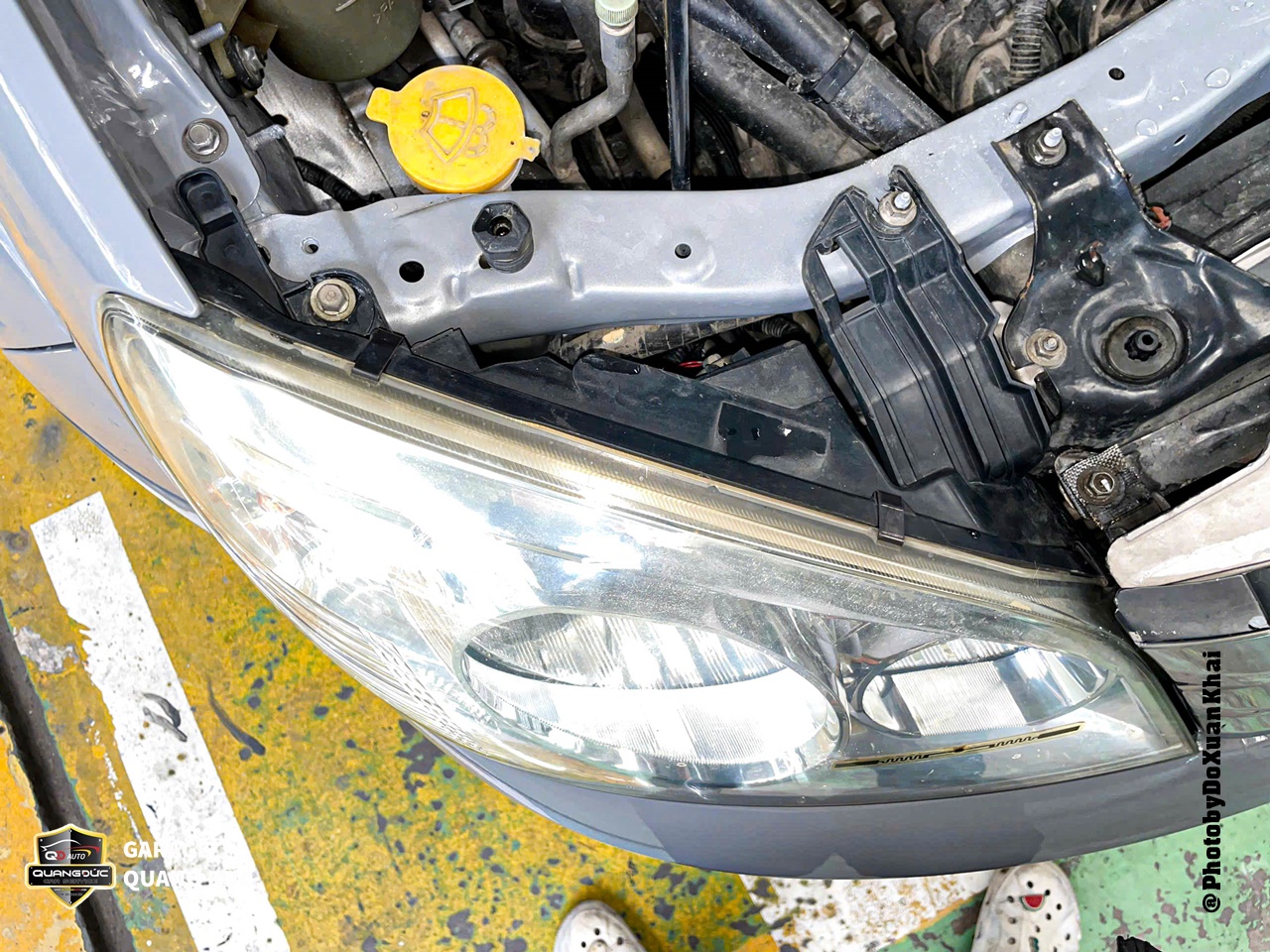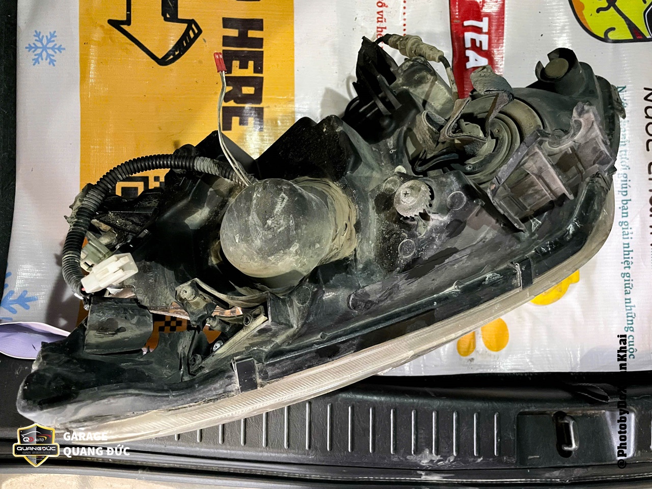 Phần đầu bị vỡ đèn chiếu sáng bên phụ được thay thế bằng một cụm đèn mới là hàng tháo xe loại đẹp để tiết kiệm chi phí, bên cạnh đó chủ xe cũng thay luôn đèn bên lái ( trước đây là đèn độ bi) về cụm đèn pha cos nguyên bản theo xe).