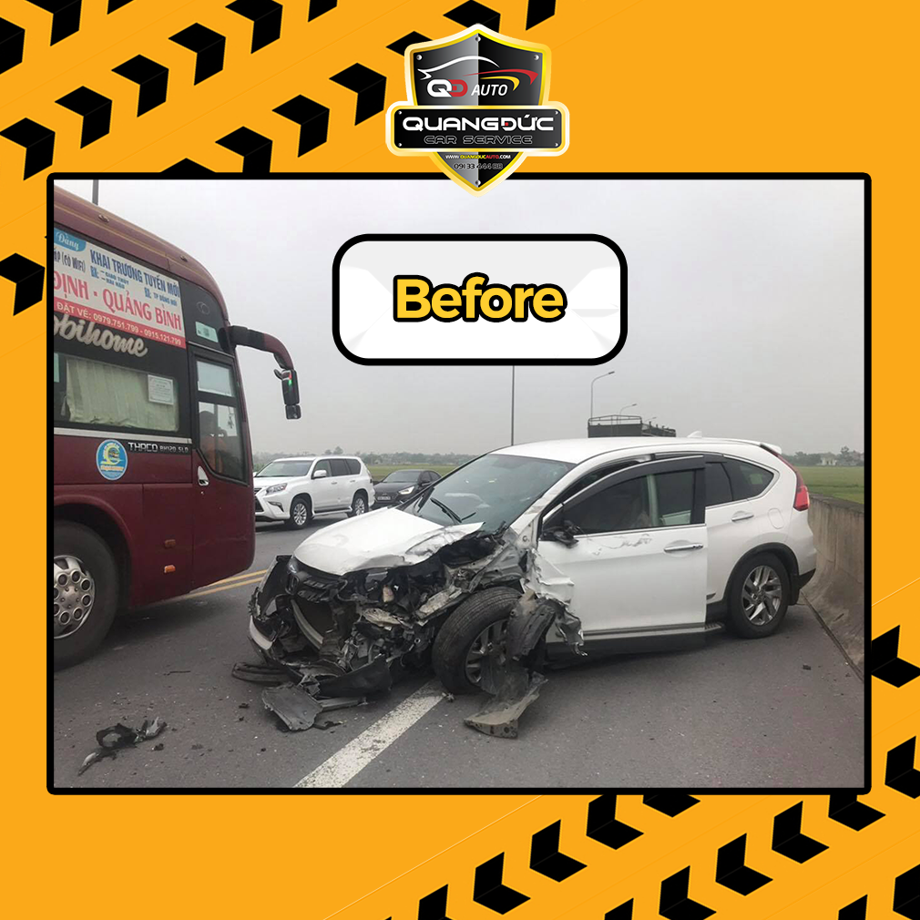 Sau va chạm mạnh em CRV đã hỏng nặng phần đầu và được đưa về Quang Đức Auto để tiến hành kiểm tra tổng thể. Toàn bộ phần khung sườn đầu xe bên trái đã dập nát cần được kéo, gò và sơn lại.