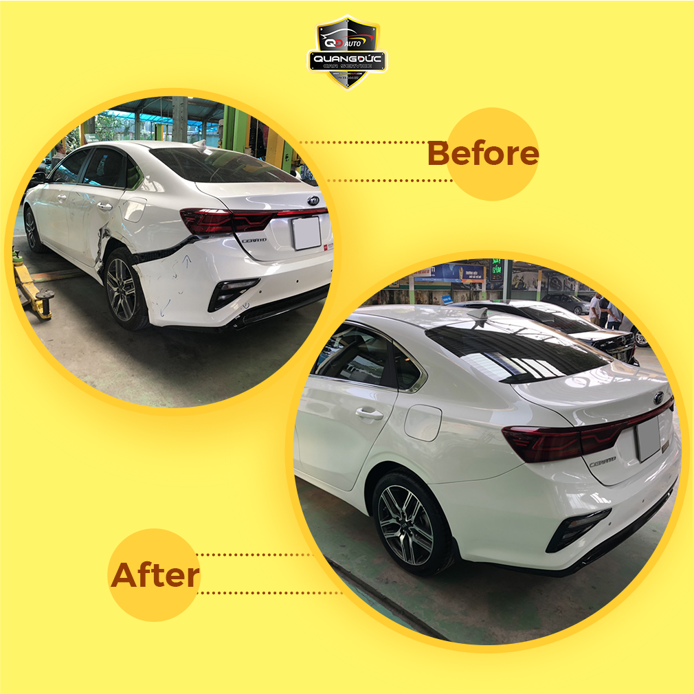 Cú va chạm mạnh đã khiến “em” Kia Cerato bị gãy phần cản sau và dập mạnh phần cửa sau. Sau quá trình kiểm tra tổng thể các phần: phần cứng, phần mềm, khung gầm máy, hệ thống phanh, chiếc Kia Cerato đã được tiến hành phục hồi toàn diện theo đúng quy trình chuẩn tại Quang Đức Auto: