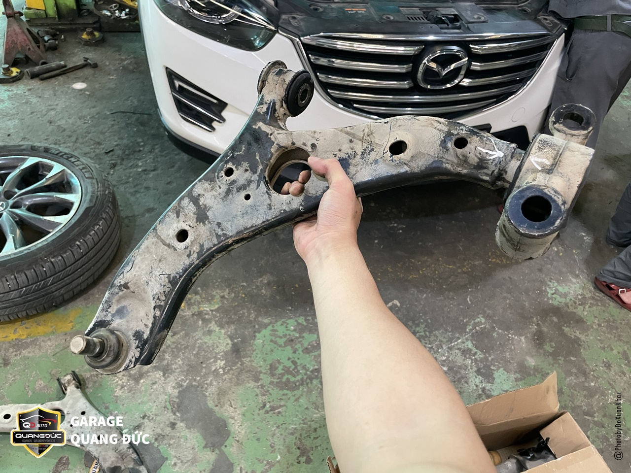 Giảm xóc ô tô là bộ phận quan trọng giúp giảm tối đa rung động trong quá trình xe di chuyển xe. Còn Càng A có chức năng chống rung lắc, duy trì các góc nghiêng/góc chụm, tiết kiệm không gian gầm xe phía trước, đồng thời đảm bảo chiếc xe hoạt động ổn định trên mọi cung đường. Bởi vậy, sau khi thấy gầm xe có tiếng kêu lạ khó chịu khi đi vào ổ gà, gờ giảm tốc, những chỗ xóc, chủ xe MAZDA CX5 đã tới ngay Garage Quang Đức Auto để tiến hành kiểm tra, sửa chữa.