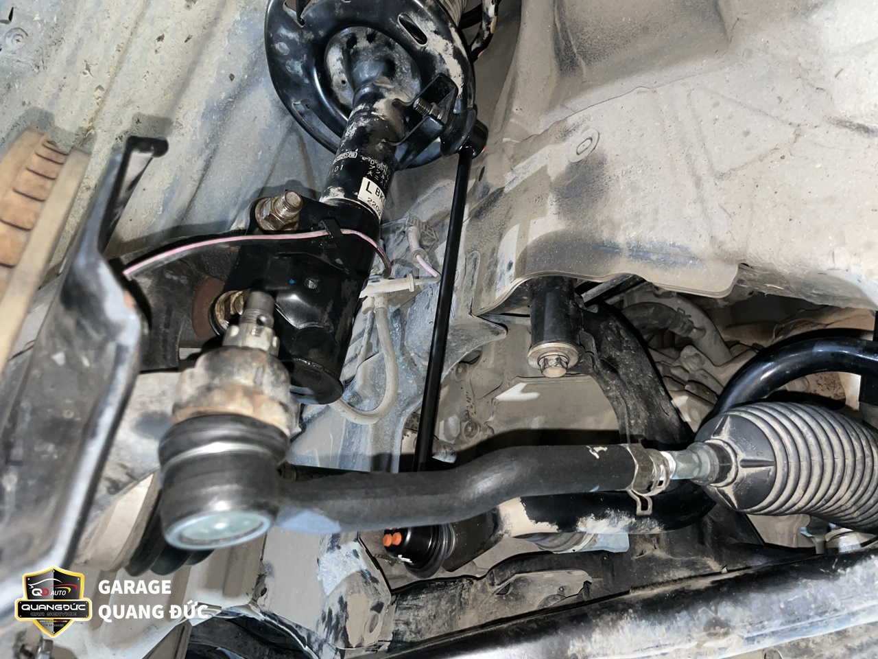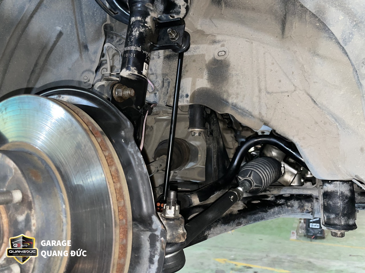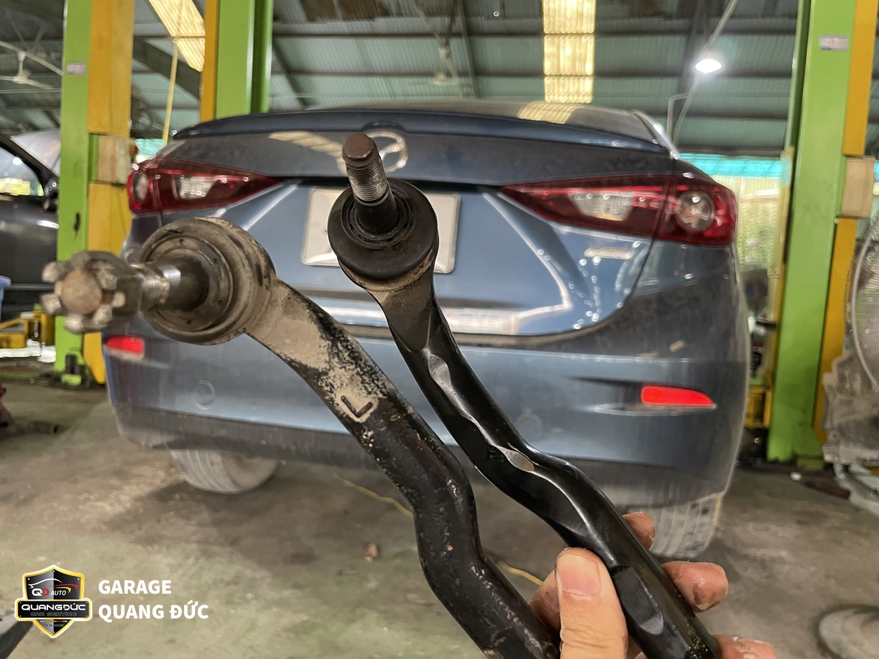 Rotuyn cân bằng, Rotuyn lái trong lái ngoài đảm bảo cho chiếc xe không bị rung lắc, kêu lọc cọc cũng như điều hướng xe theo ý muốn của người lái. Bị hỏng Rotuyn rất nguy hiểm bởi nó có thể khiến tài xế mất lái và gây ra những tai nạn nghiêm trọng. Còn tăm bông giảm xóc hoãn giảm các xung lực và lực sốc, đảm bảo chiếc xe hoạt động ổn định trên mọi cung đường gập ghềnh, ổ gà. Bởi vậy, sau khi thấy gầm xe có tiếng kêu lạ, rung lắc vô lăng, khó điều khiển, đi không êm chủ xe MAZDA3 đã tới ngay Garage Quang Đức Auto để tiến hành kiểm tra, sửa chữa.