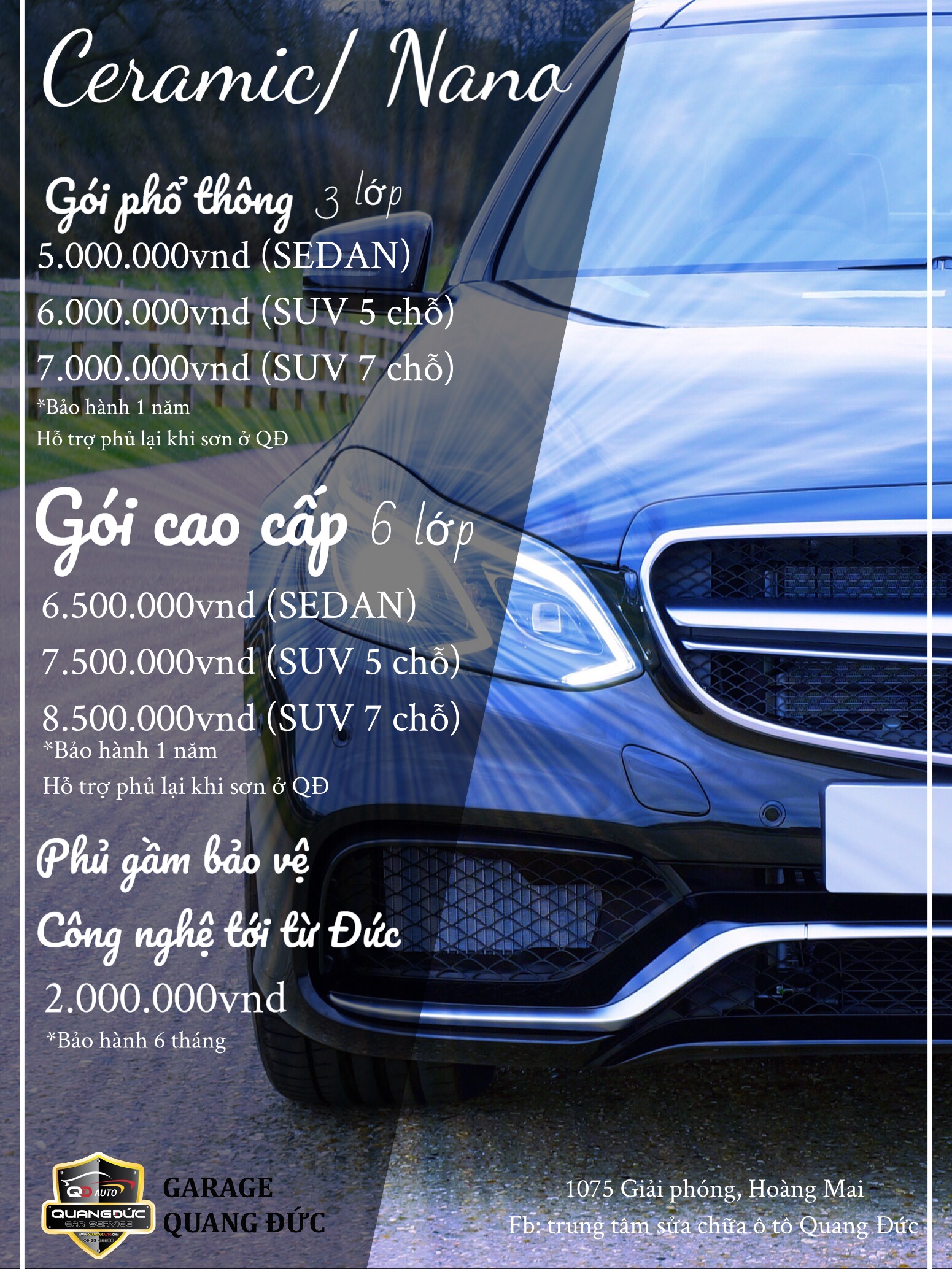 Trung Tâm ô tô Quang Đức là một trong những thương hiệu uy tín về sửa chữa ô tô nói chung cũng như những dịch vụ làm đẹp cho "xế yêu" nói riêng. Phủ ceramic cũng là một trong nhưng dịch vụ được khách hàng tin dùng ở Quang Đức. Trung tâm cam kết chỉ sửa dụng sản phẩm CERAKOTE- ceramic coatings được nhập khẩu chính hãng từ Nhật Bản.