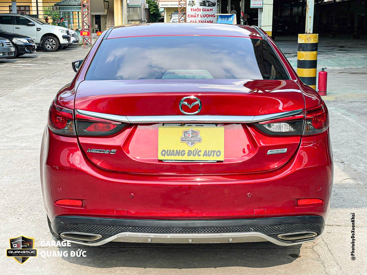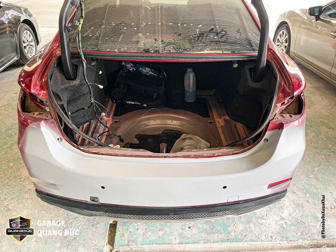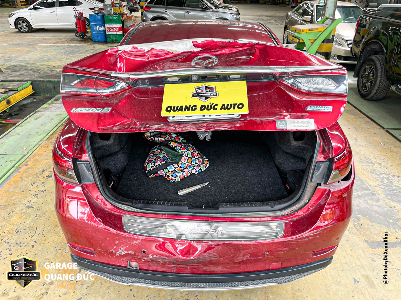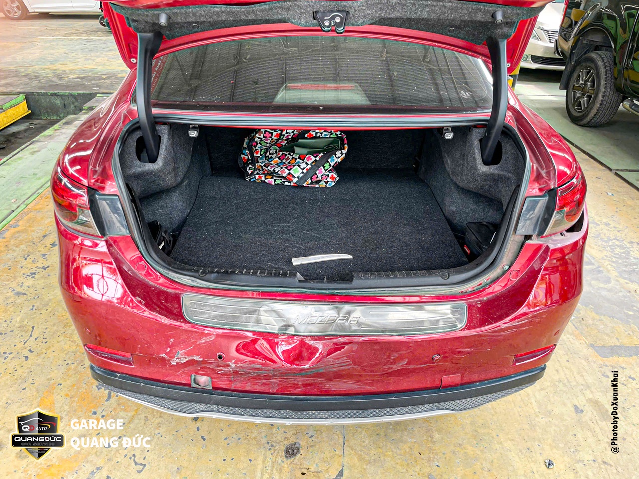 Phần BDS, của xe, khoang cốp, nắp cốp được phục hồi và phun sơn lại chuẩn màu đỏ nguyên bản của Mazda 6. Đảm bảo rằng không có vấn đề gì khác về thân vỏ sau khi phục hồi.