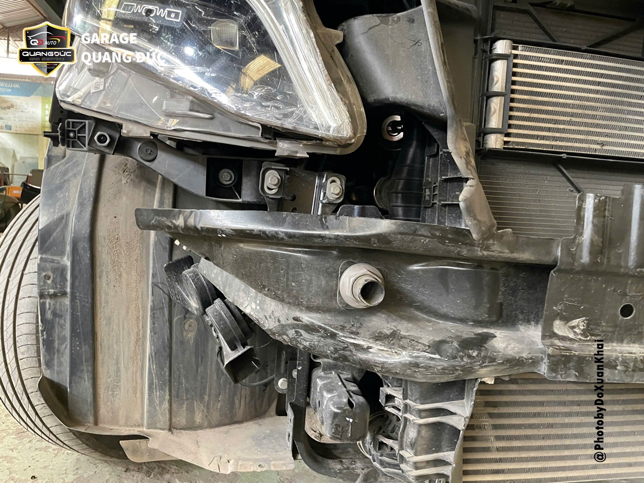 Chiếc xe được xác định hư hỏng phần đèn chiếu sáng, móp nắp capo, trầy xước rách phần BDS trước, biến dạng xương tăng cứng, hư hỏng xương nhựa sau cản, vỡ ốp giả đèn gầm...