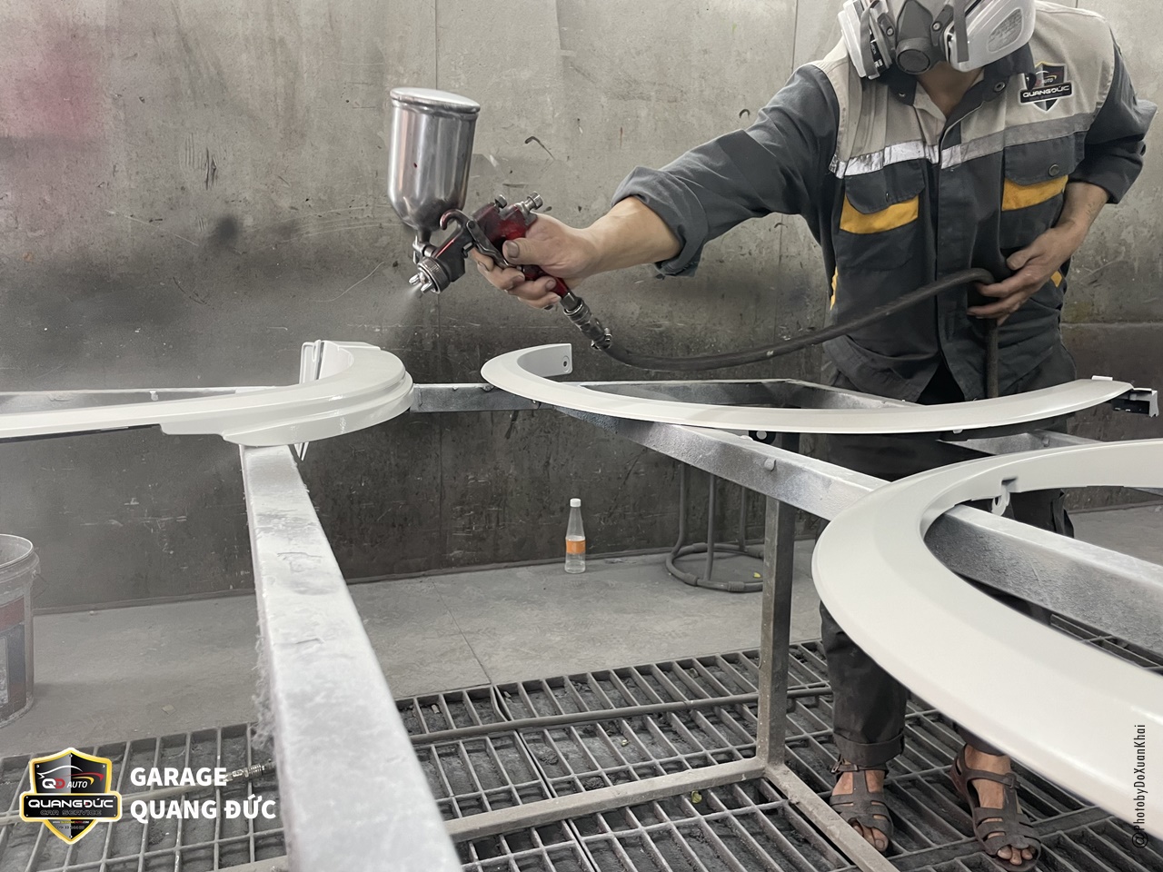 Bước 4: Phun sơn và sấy khô lần lượt với các lớp như bả matit, lớp sơn lót, sơn màu. Cuối cùng là phun sơn bóng và đánh bóng hoàn thiện.