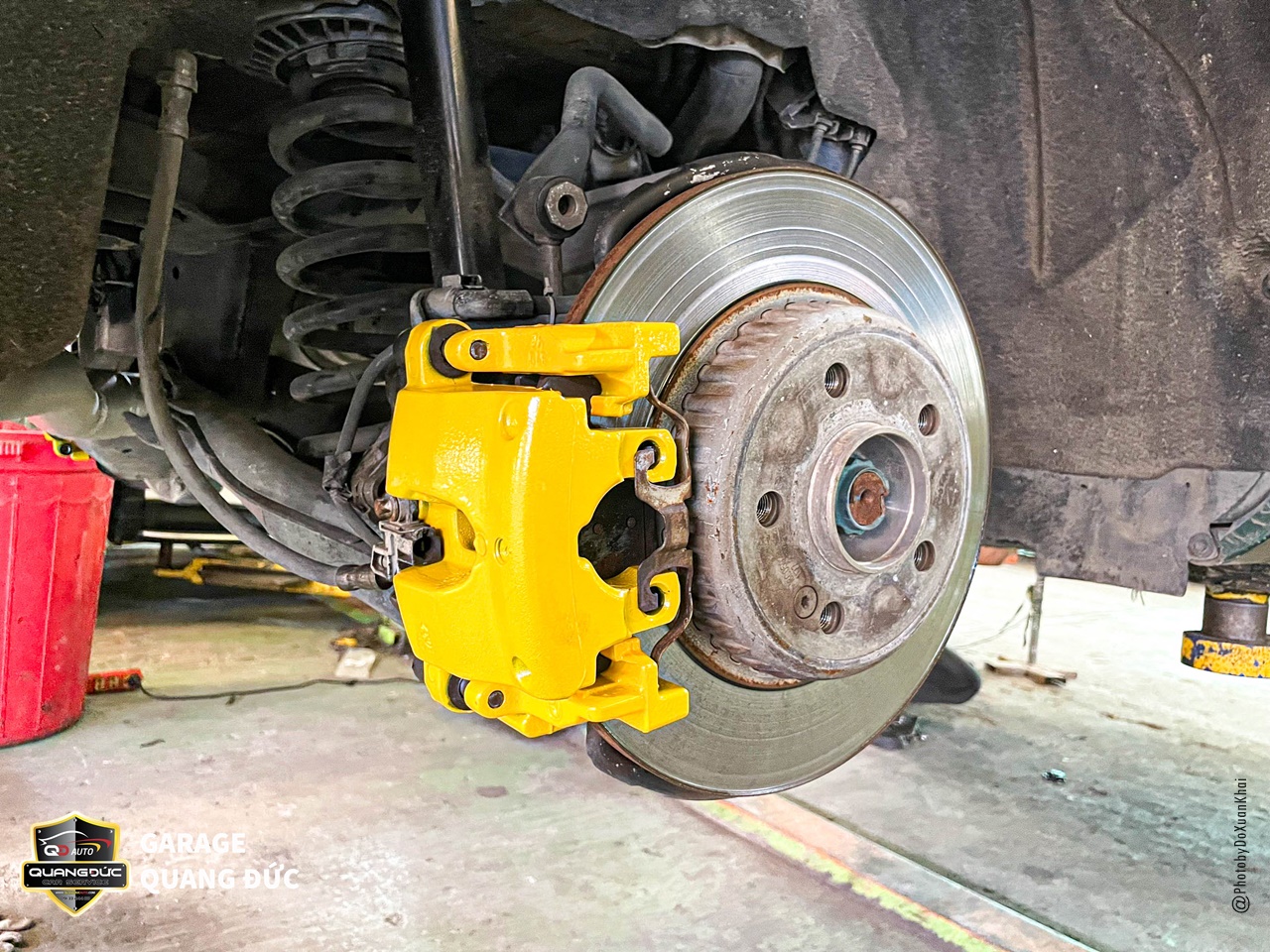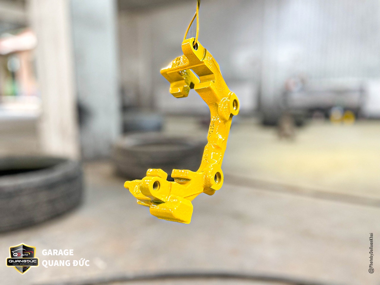 Bước 1: Kiểm tra và đánh giá tình trạng sơn cùm phanh. Sử dụng đèn kiểm tra sơn và máy đo độ dày sơn để xác định vết hư hỏng và đánh giá độ dày lớp sơn. Kết quả kiểm tra sẽ quyết định liệu có cần sơn dặm hay sơn lại toàn bộ cùm phanh.