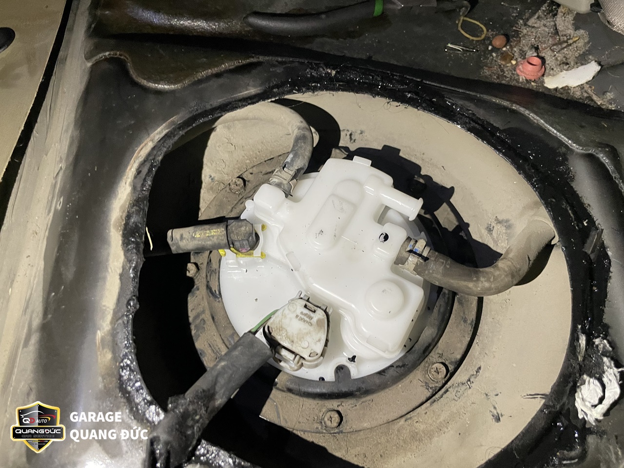Nguyên nhân là do bơm xăng bị tắc nghẽn, lọc xăng bẩn nên lượng xăng đi qua ít, động cơ không được cung cấp đầy đủ mức nhiên liệu cần thiết, lúc có lúc không, khiến máy có máy không dẫn đến tình trạng bỏ máy khi động cơ hoạt động. Sau khi nắm bắt được tình trạng đó, Quang Đức Auto đã tiến hành thay thế cụm bơm xăng mới trên chiếc Toyota Altis.
