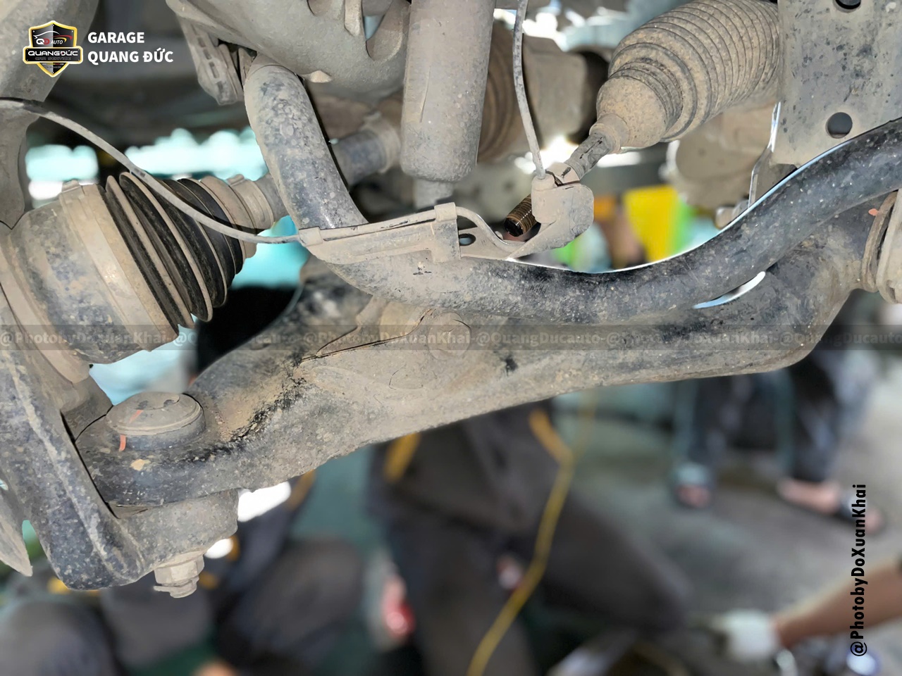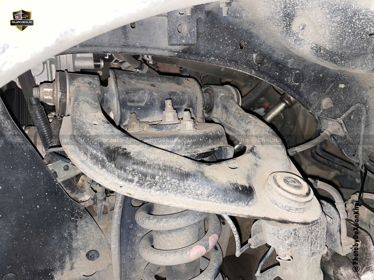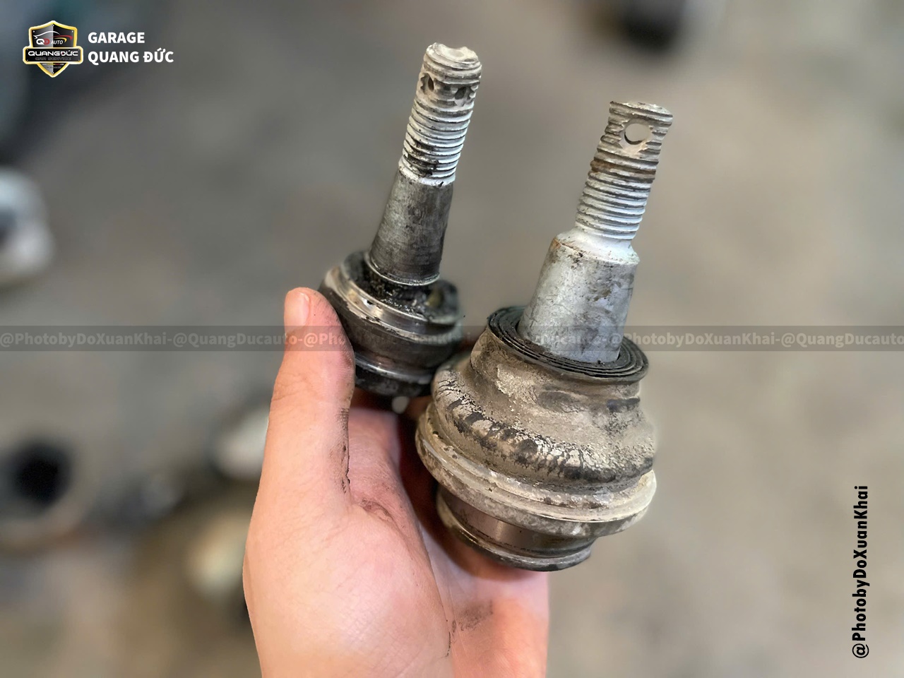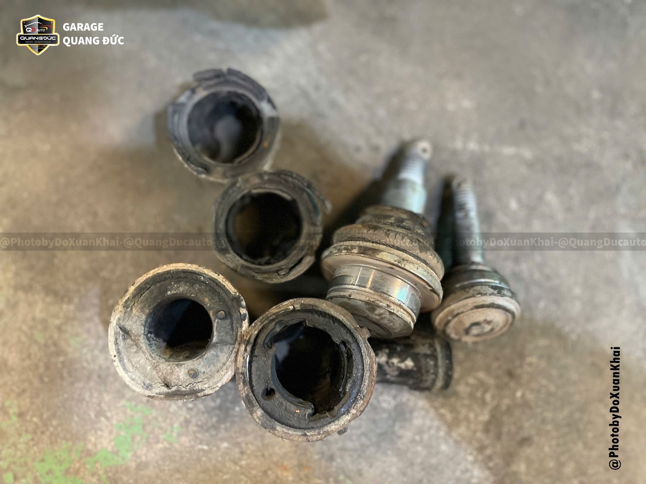 Sau khi kiểm tra, đội ngũ kỹ thuật của Quang Đức Auto đã nhận thấy Cao su càng A dưới ( To, nhỏ) bị nứt, mòn do oxi hóa, đó cũng là tình trạng của càng A trên, Rotuyn trụ đứng nơi các khớp nối bị bụi bẩn bám vào sâu bên trong gây bó kẹt do đó cần thay thế các chi tiết này.