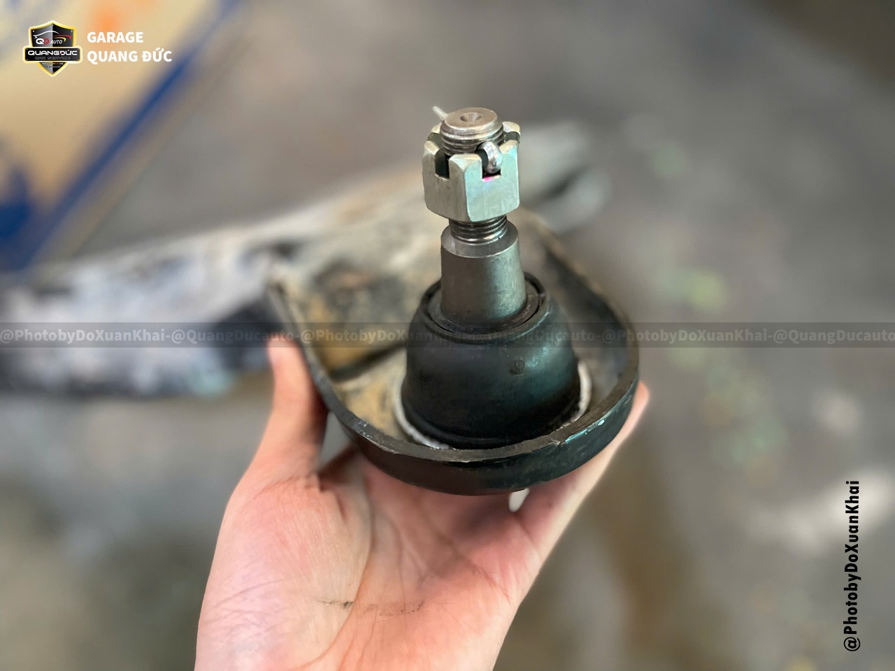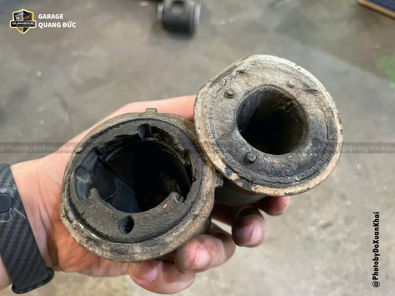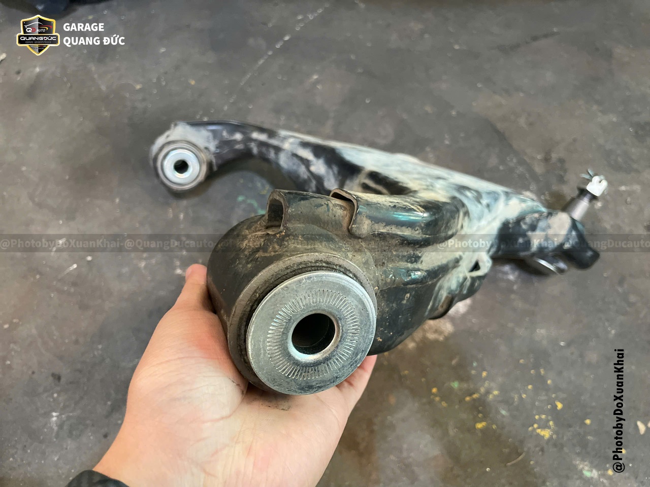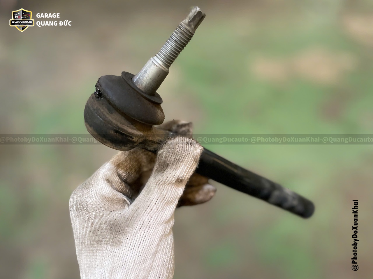 Sau khi kiểm tra, đội ngũ kỹ thuật của Quang Đức Auto đã nhận thấy Cao su càng A dưới ( To, nhỏ) bị nứt, mòn do oxi hóa, đó cũng là tình trạng của càng A trên, Rotuyn trụ đứng nơi các khớp nối bị bụi bẩn bám vào sâu bên trong gây bó kẹt do đó cần thay thế các chi tiết này.