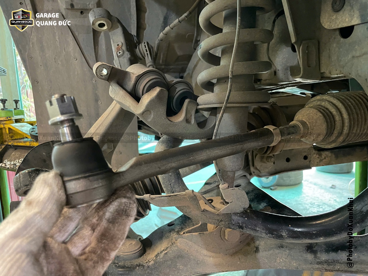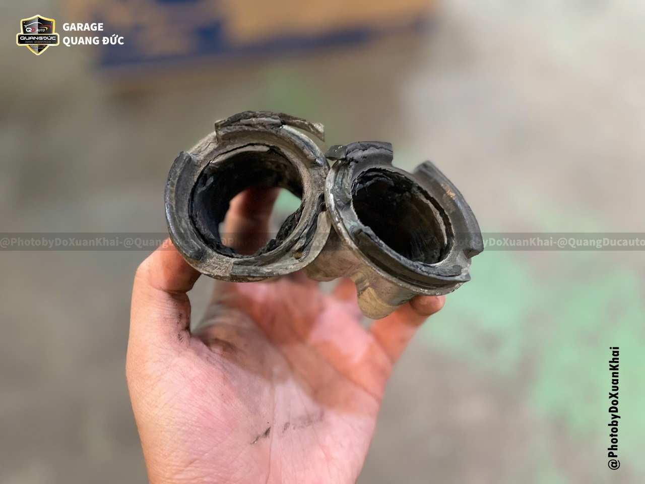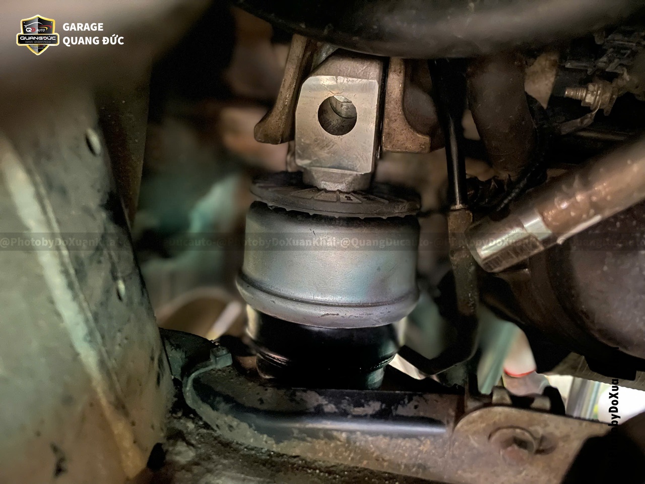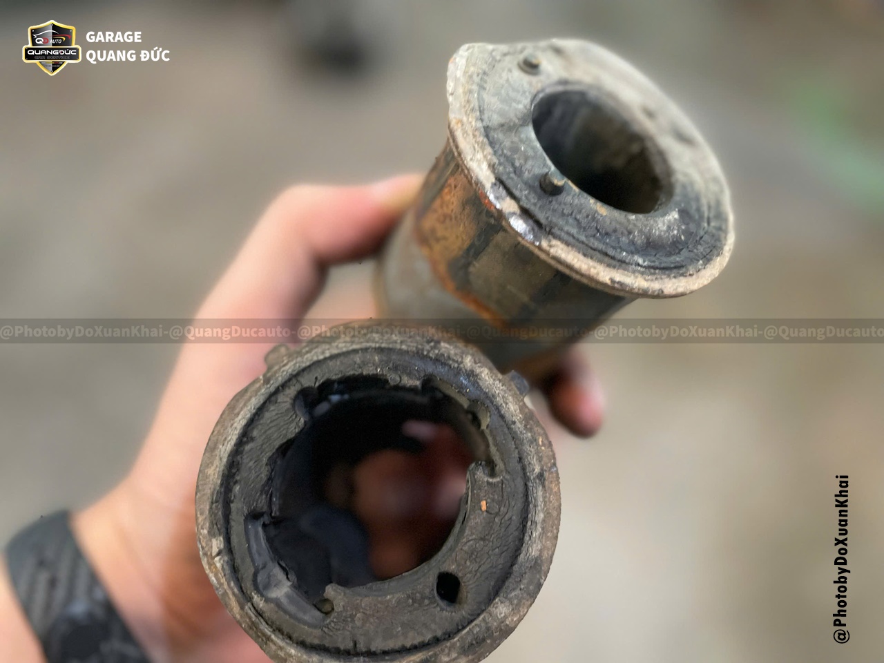 Sau khi kiểm tra, đội ngũ kỹ thuật của Quang Đức Auto đã nhận thấy Cao su càng A dưới ( To, nhỏ) bị nứt, mòn do oxi hóa, đó cũng là tình trạng của càng A trên, Rotuyn trụ đứng nơi các khớp nối bị bụi bẩn bám vào sâu bên trong gây bó kẹt do đó cần thay thế các chi tiết này.