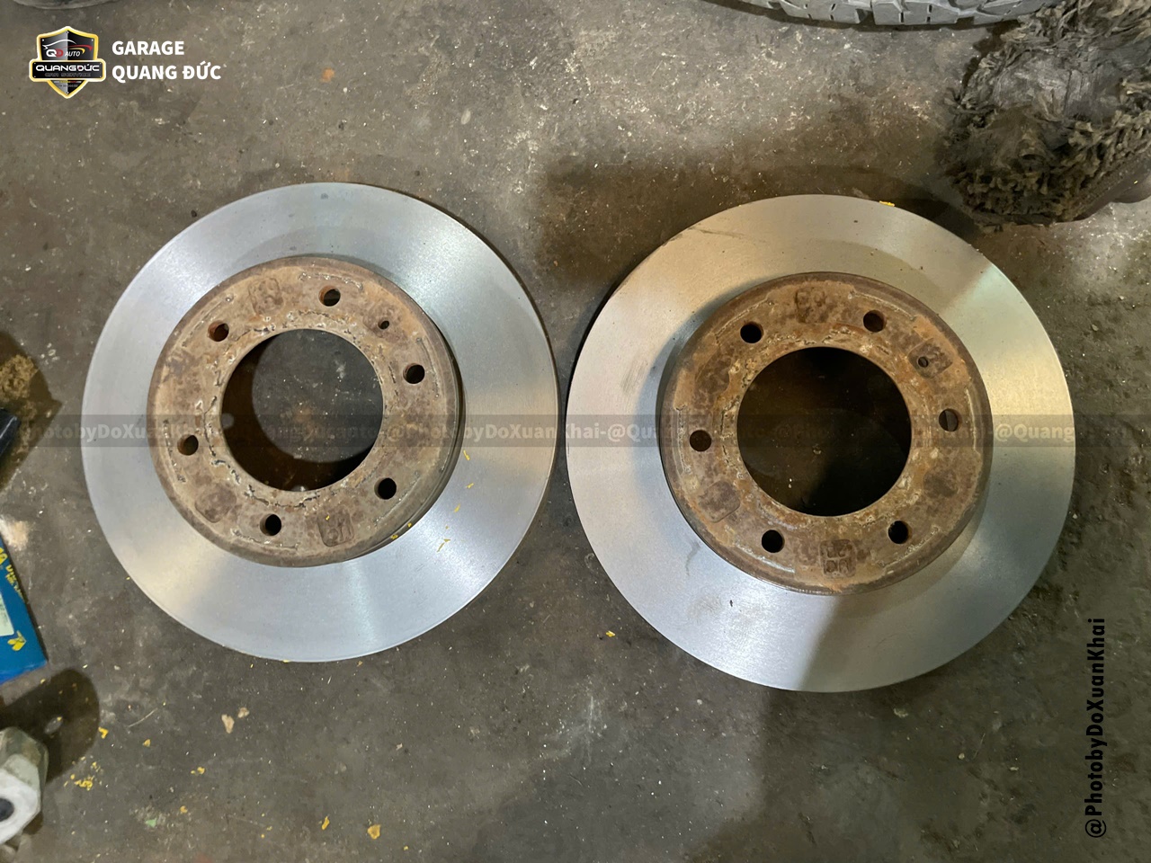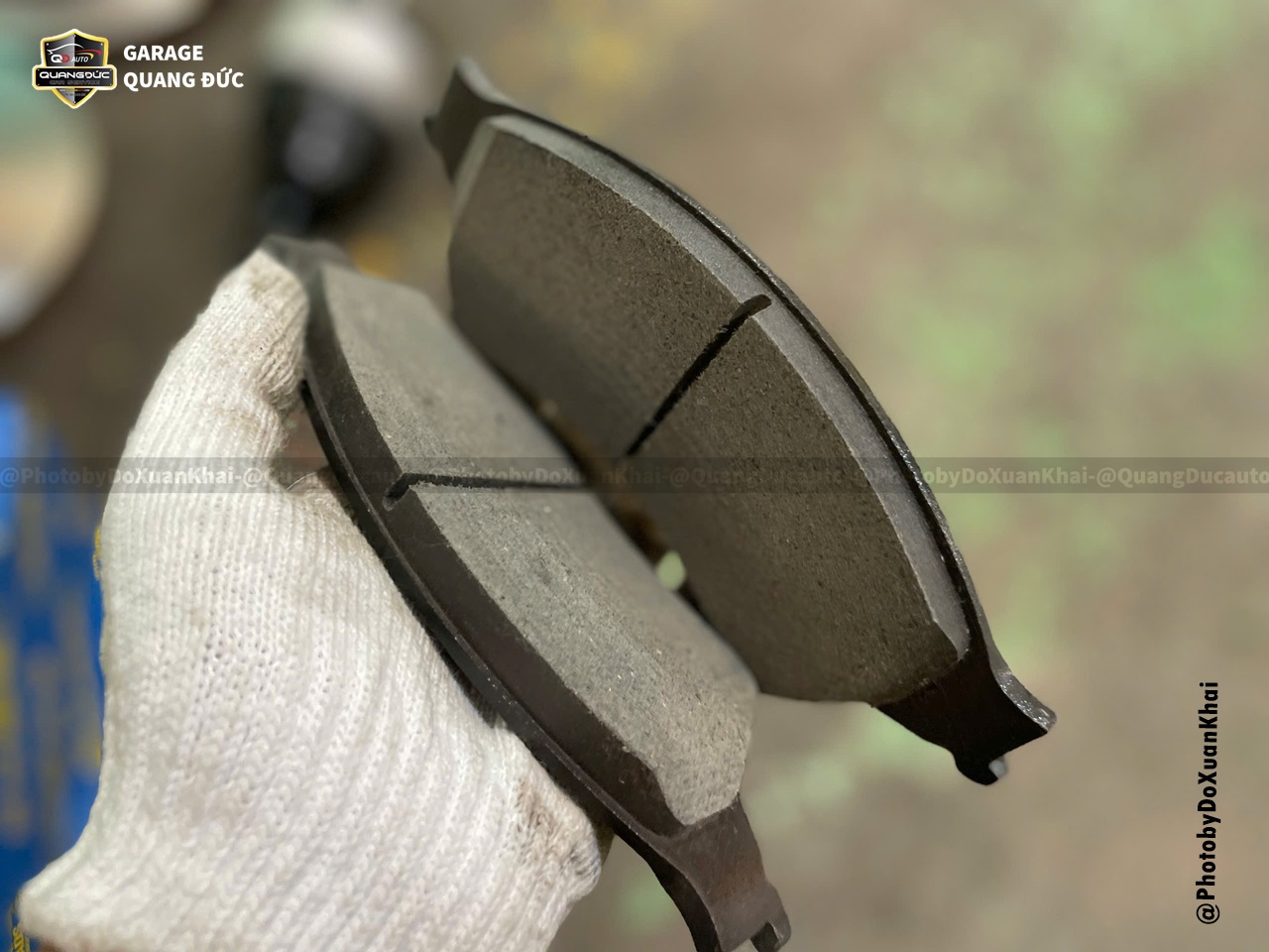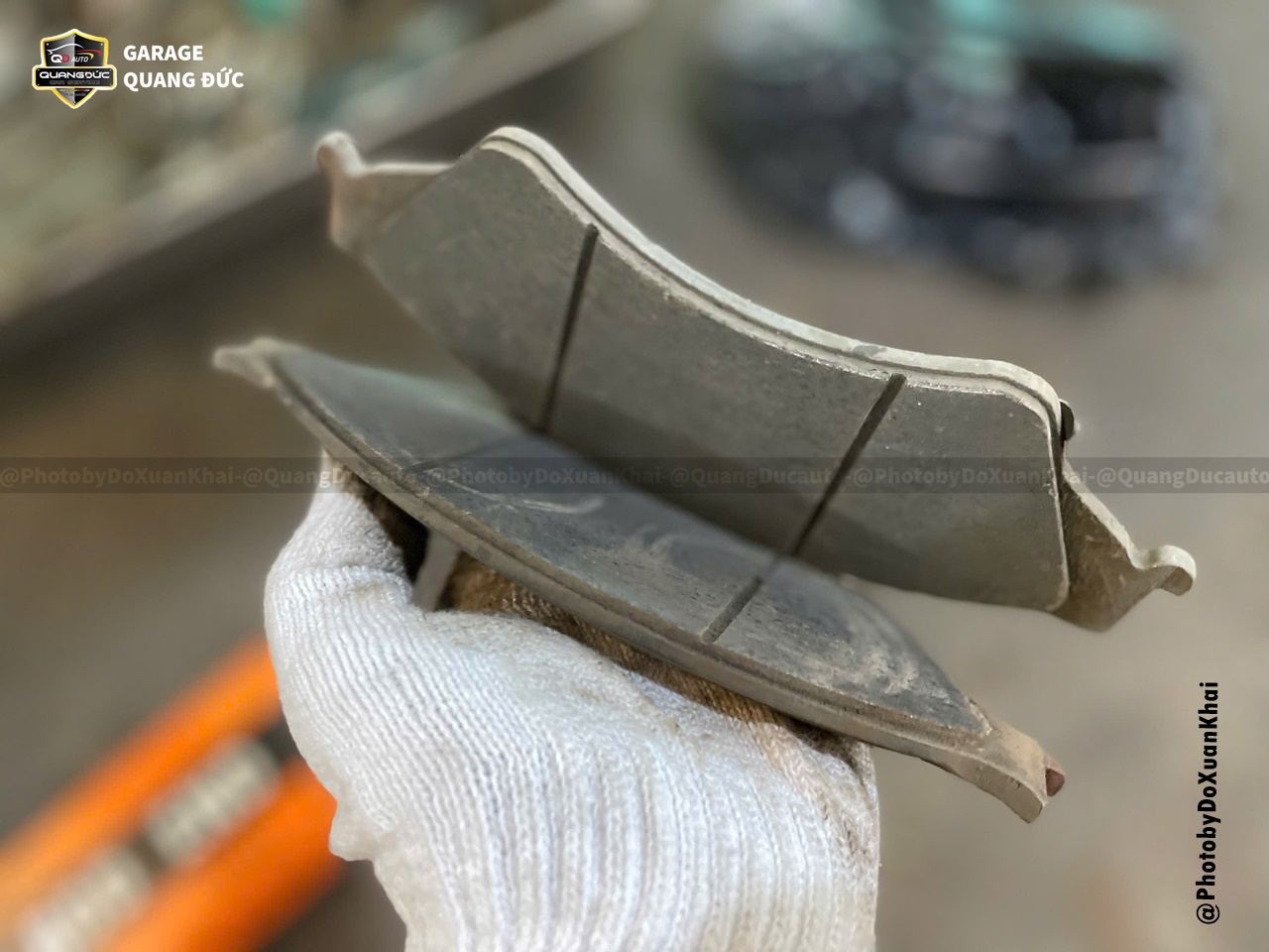 Vệ sinh má, đĩa phanh: Loại bỏ các bụi bẩn, tăng hiệu quả mát giữa má phanh và đĩa phanh, Tuy nhiên trên chiếc xe này má phanh đã mòn hết nên cần phải thay thế mới hàng xịn chuẩn mã theo xe. Cùng với đó đĩa phanh xuất hiện những vết xước sâu cần được gia công lại