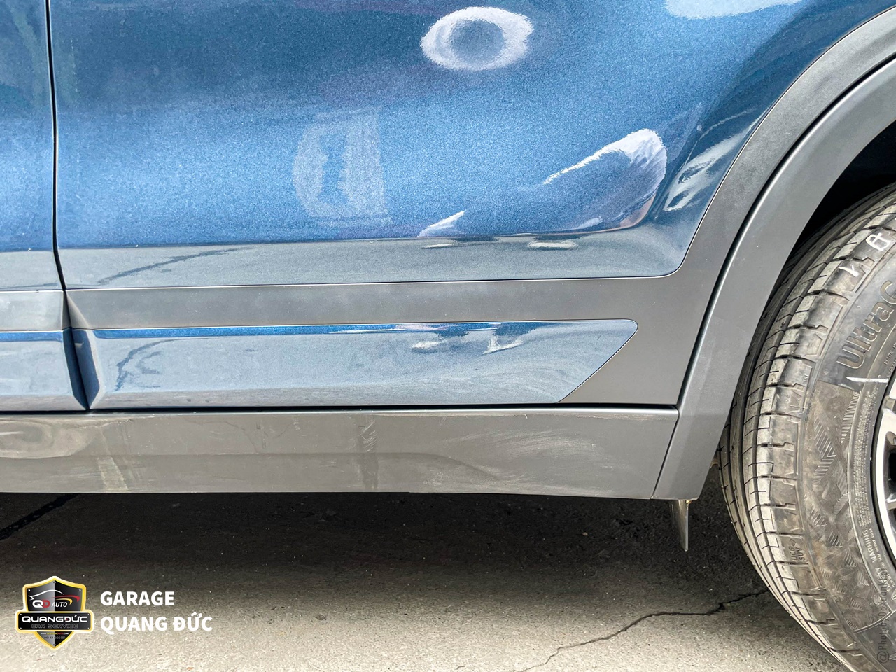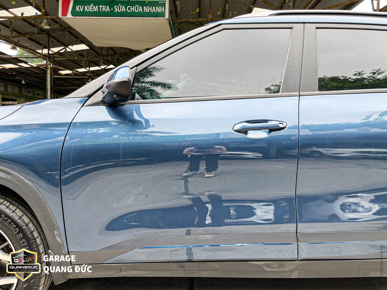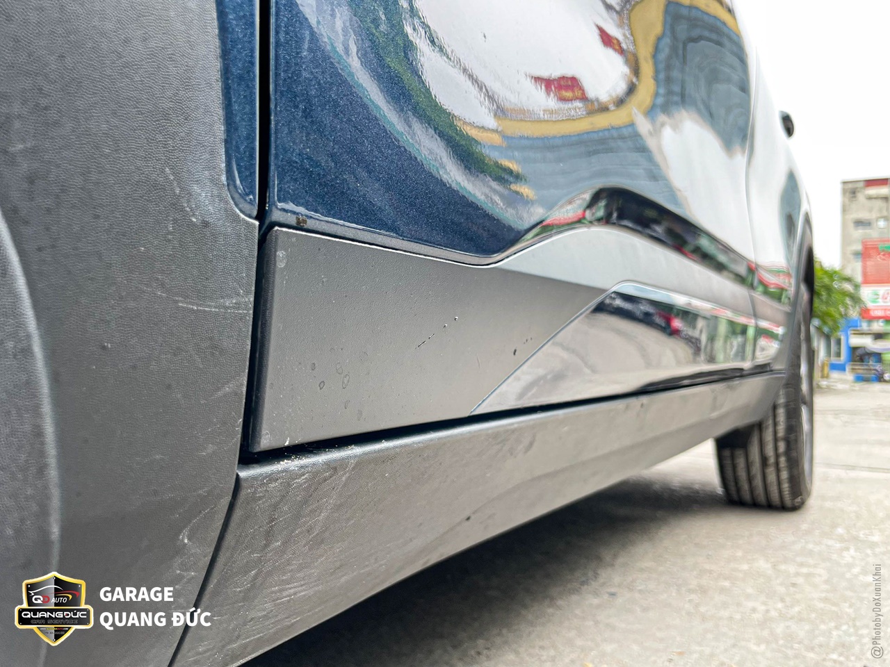 Hai cánh cửa được gò nắn, phun sơn lại chuẩn màu xanh theo xe, trong đó các vị trí ốp đen bên dưới cũng được phục hồi sơn mới với sơn Dupont.