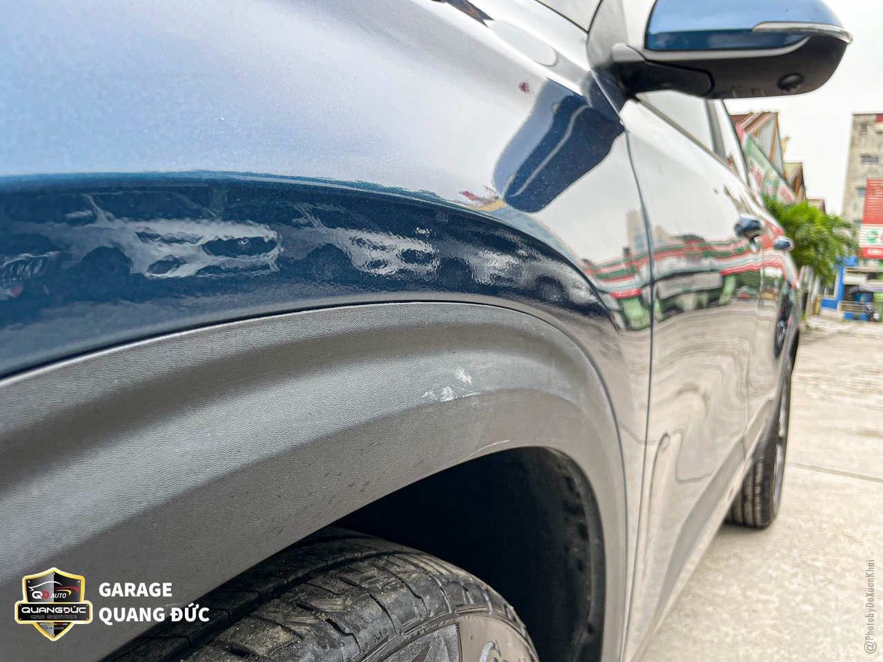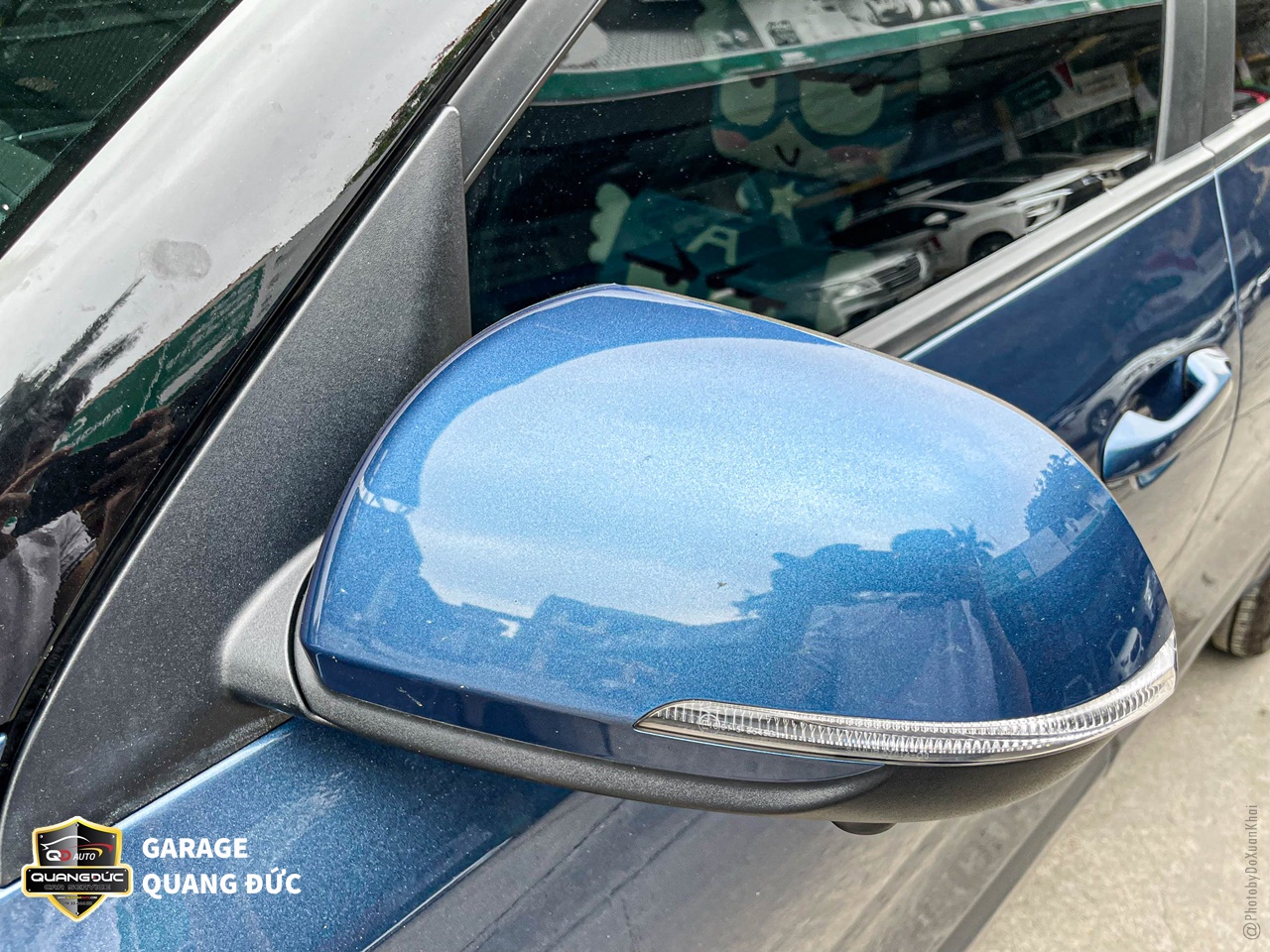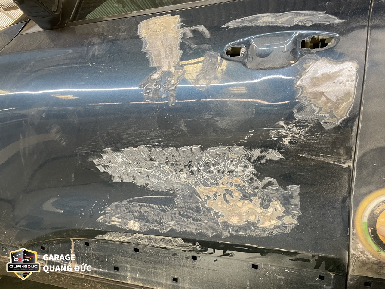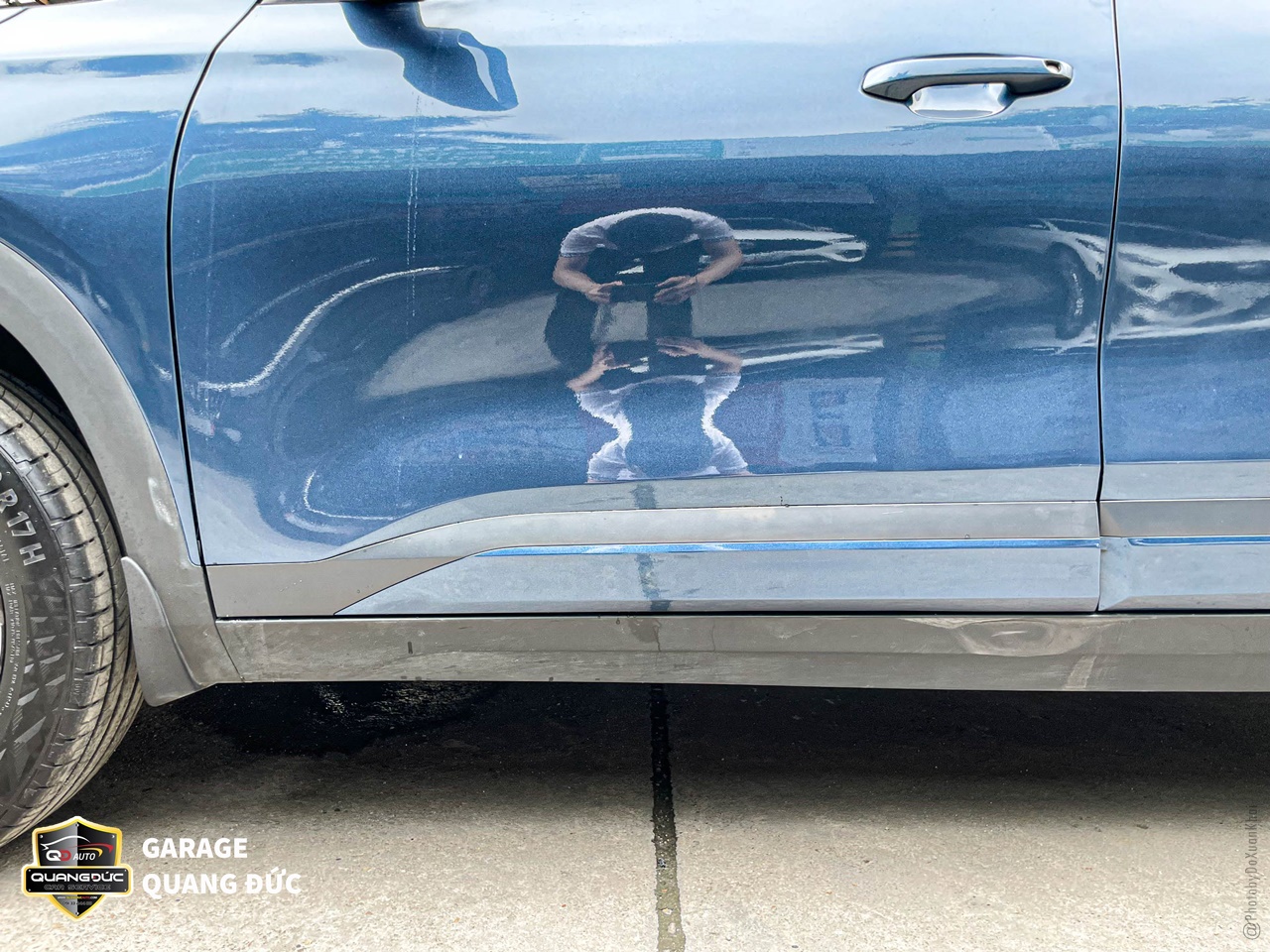 Hai cánh cửa được gò nắn, phun sơn lại chuẩn màu xanh theo xe, trong đó các vị trí ốp đen bên dưới cũng được phục hồi sơn mới với sơn Dupont.