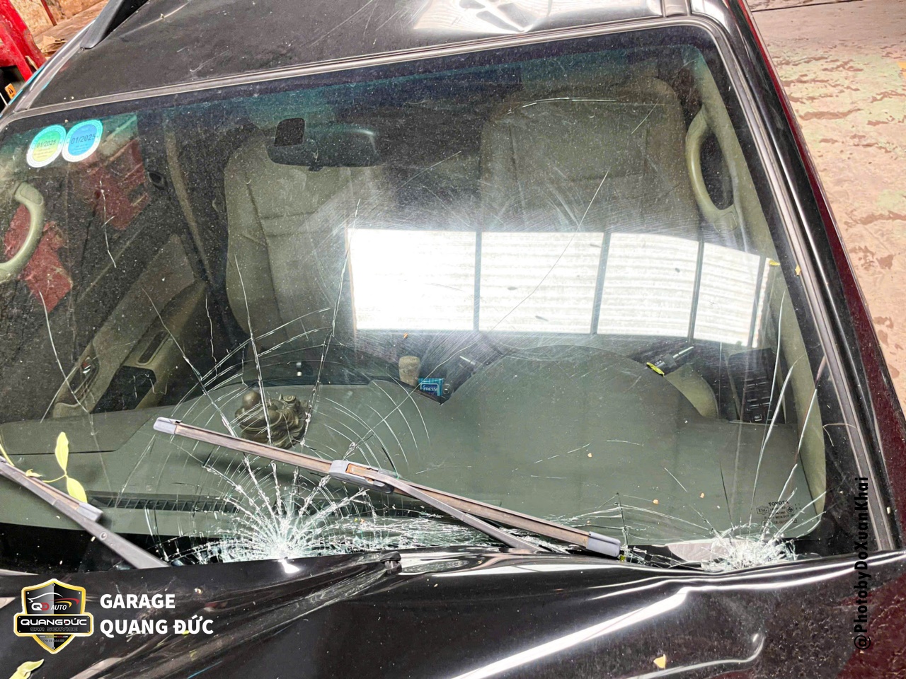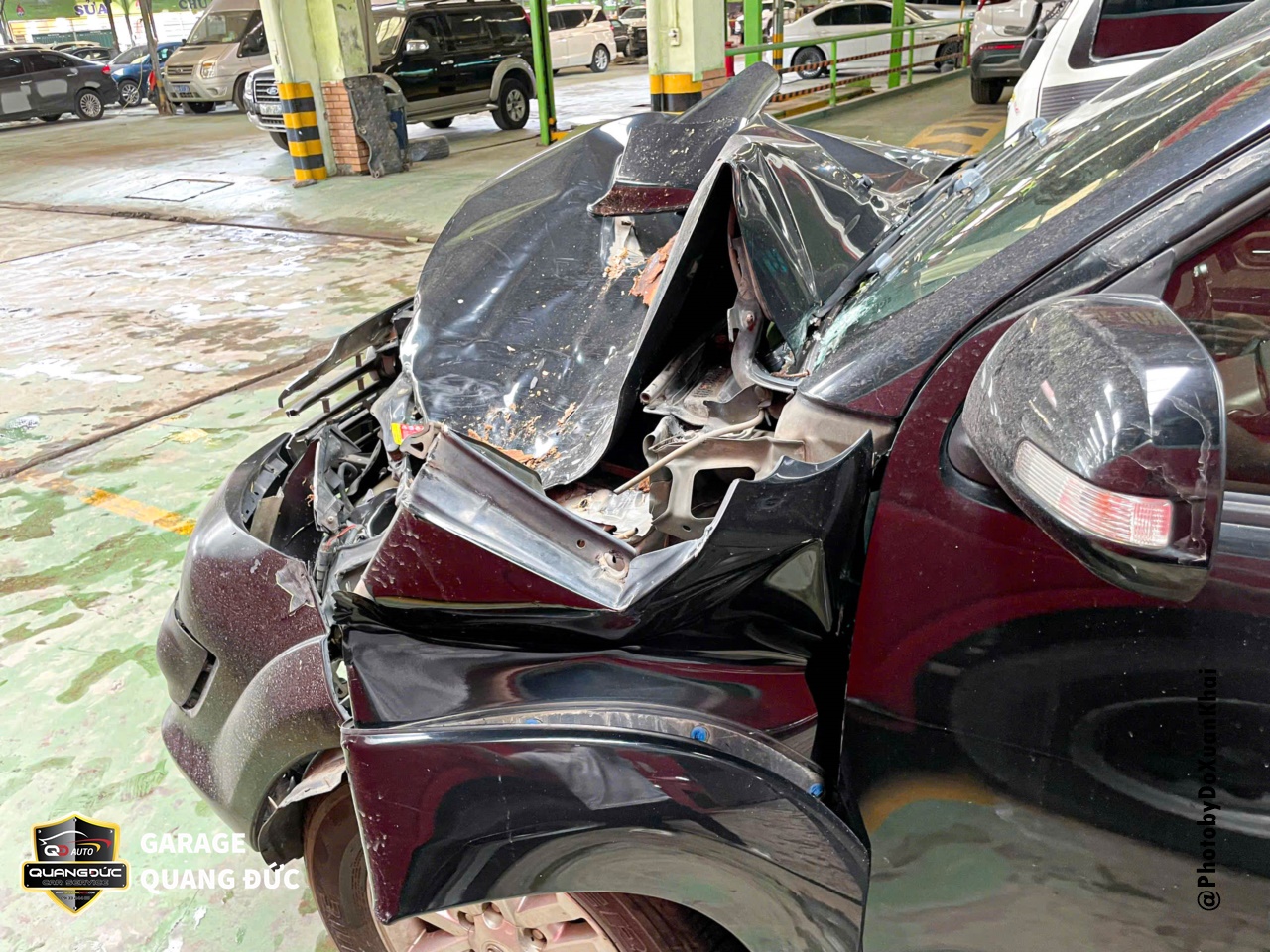 Chiếc xe được xác định hư hỏng nặng các chi tiết thân vỏ như: tai xe, nắp capo, cản trước, mặt calang, kính chắn gió phía trước,...