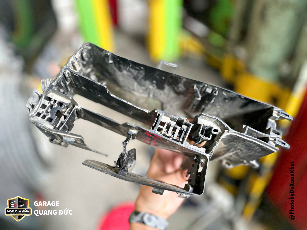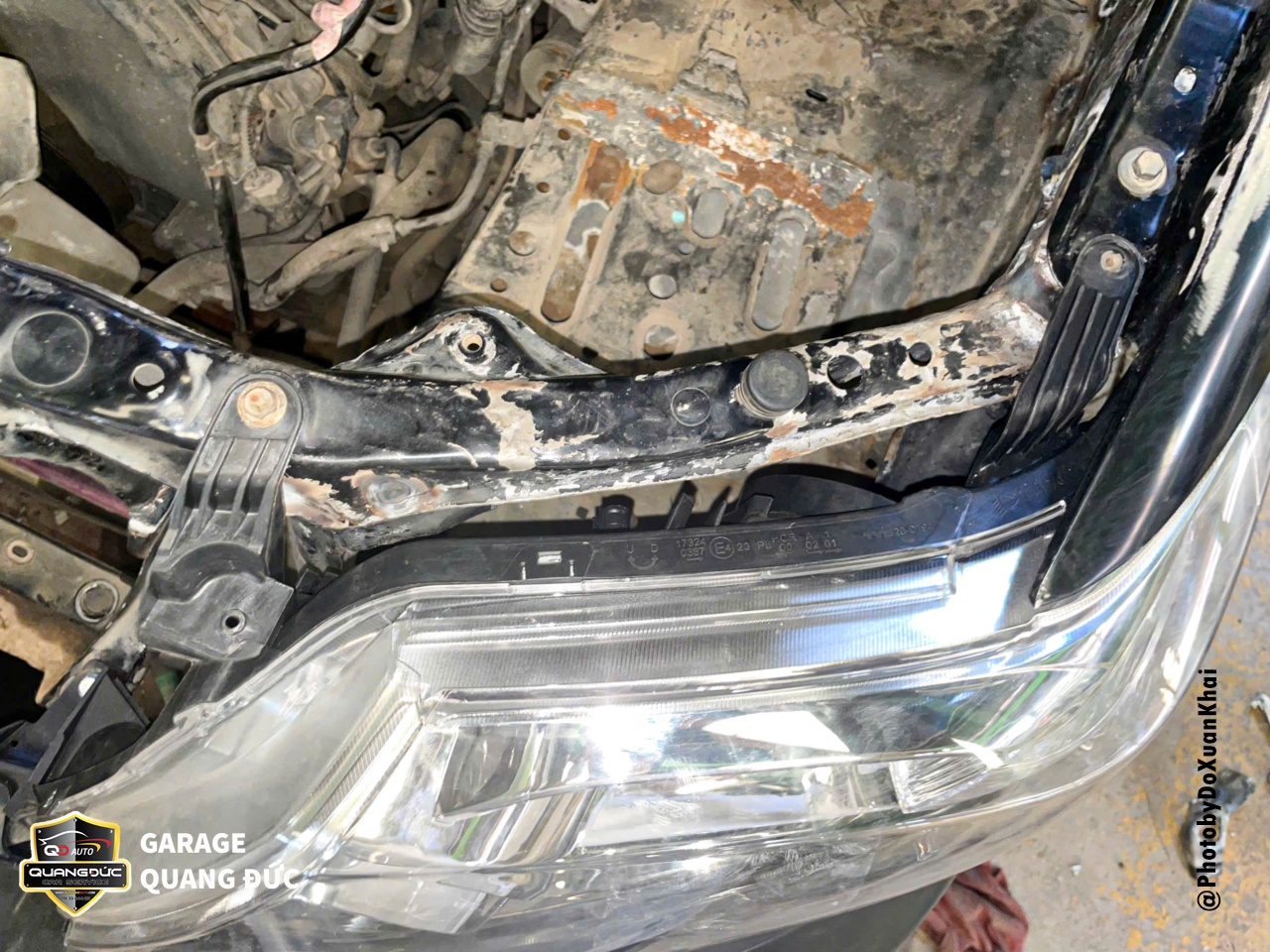 Phần đầu bị vỡ đèn chiếu sáng bên lái được thay thế bằng một cụm đèn mới là hàng tháo xe loại đẹp để tiết kiệm chi phí, còn đèn bên phụ được hàn lại chân.
