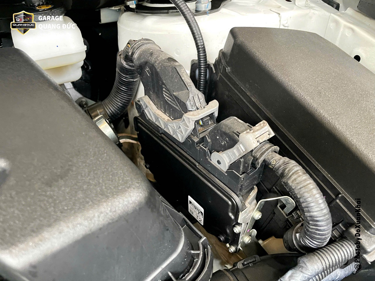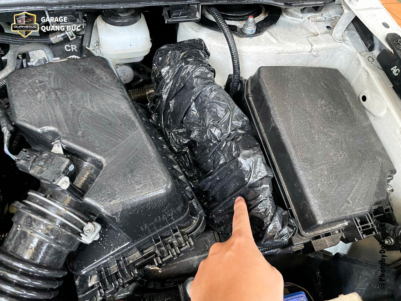 Bọc các vị trí quang trọng cần tránh nước như hộp điều khiển ECU, họng hút vào bầu lọc gió,... sau đó dùng máy rửa xe cao áp xịt sơ qua để đánh bật bớt bụi bẩn trong khoang máy.