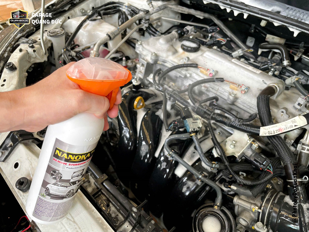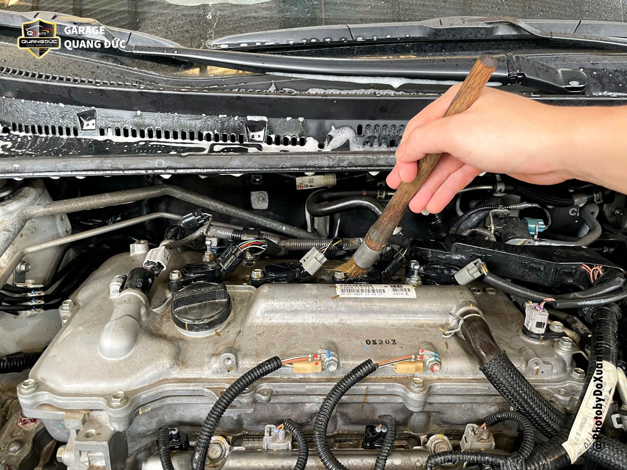 Phun hóa chất tẩy rửa khoang máy oto đều lên bề mặt các chi tiết, và đợi vài phút cho hóa chất ngấm đều. Dùng bàn chải kết hợp với chổi lông để làm sạch bề mặt cũng như các ngóc ngách.