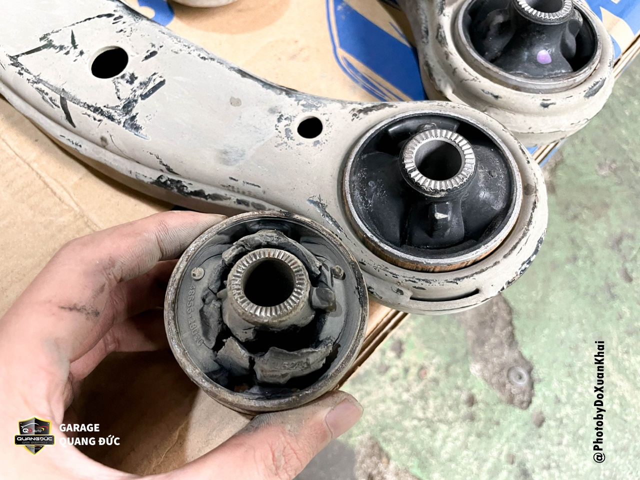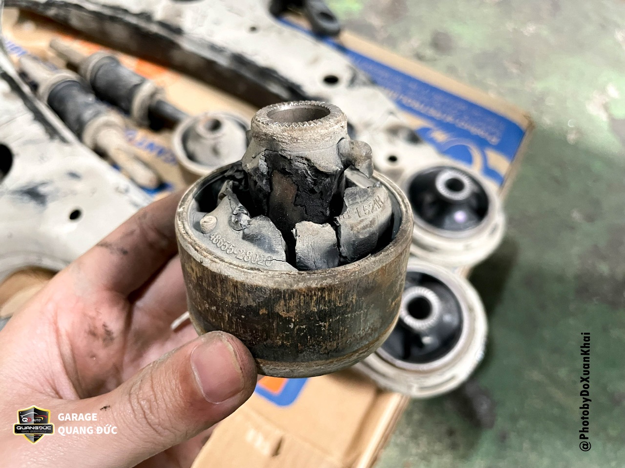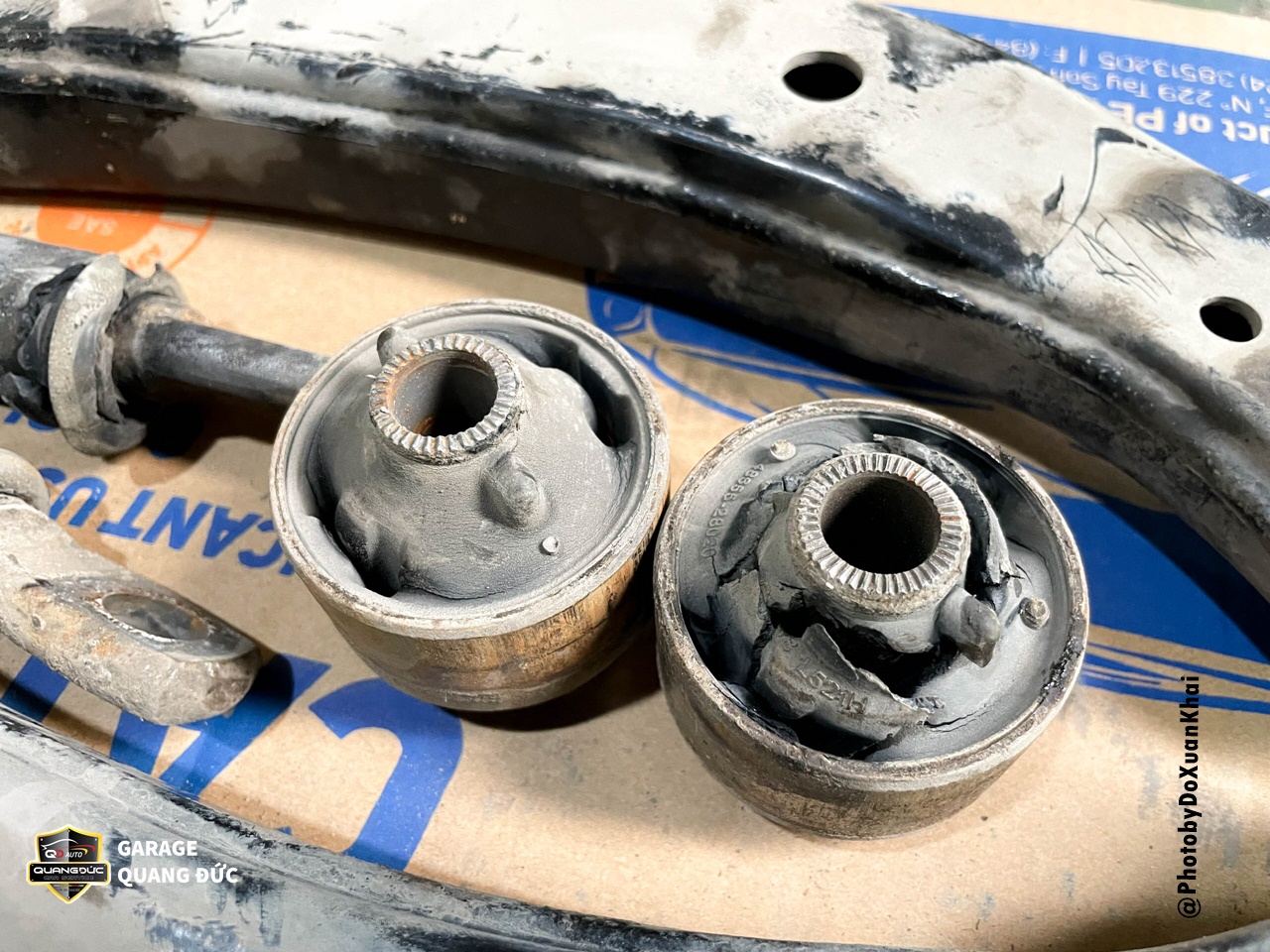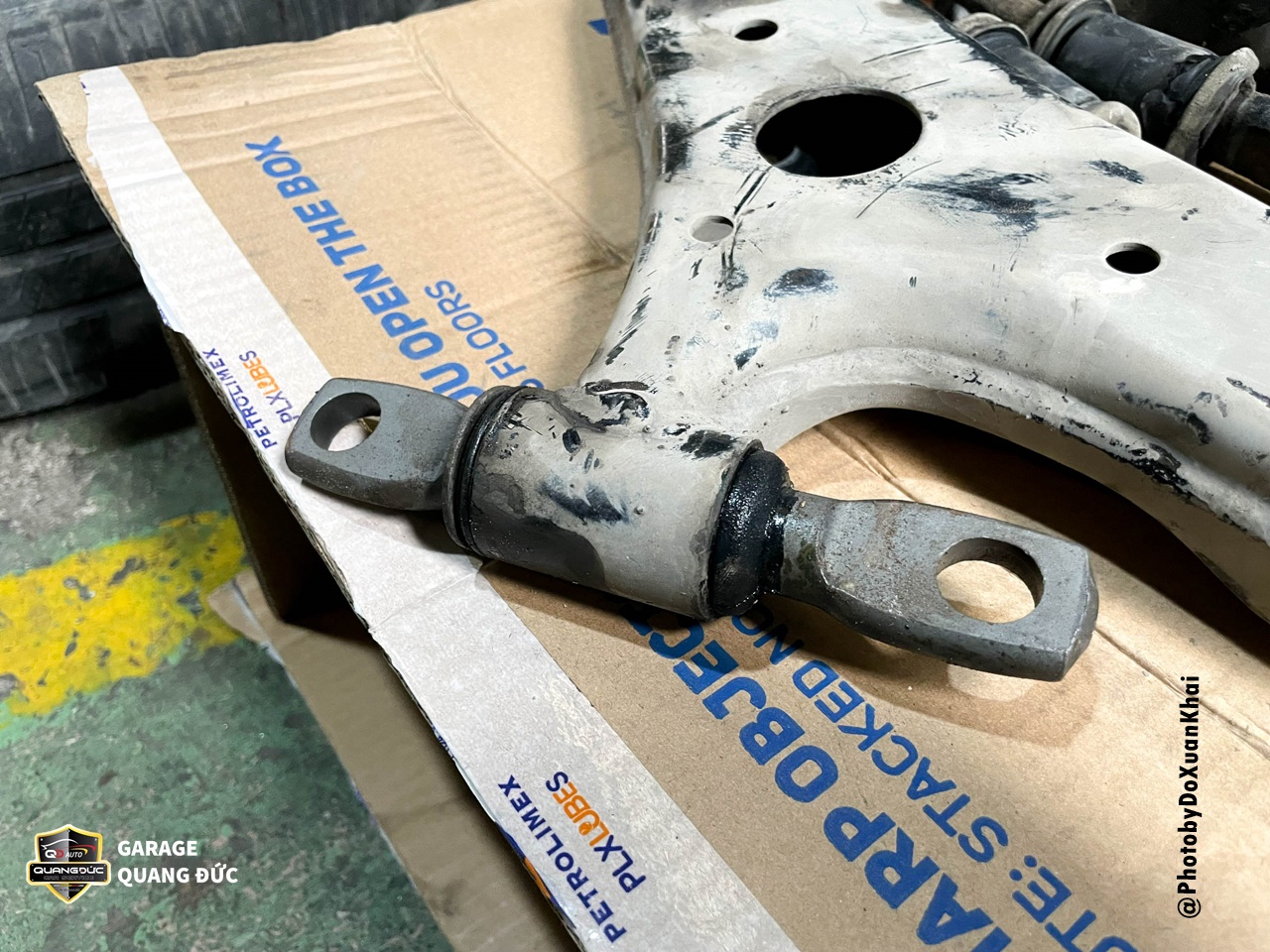Sau khi kiểm tra, đội ngũ kỹ thuật của Quang Đức Auto đã nhận thấy Cao su càng A dưới ( To, nhỏ) bị nứt, mòn do oxi hóa, thậm chí rách lớn cần thay thế các chi tiết này.