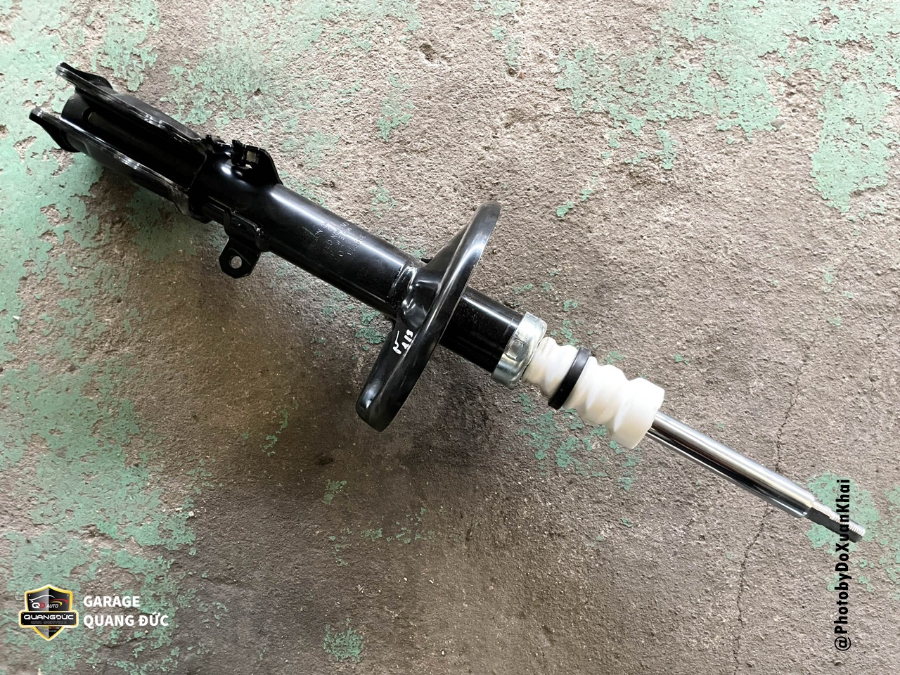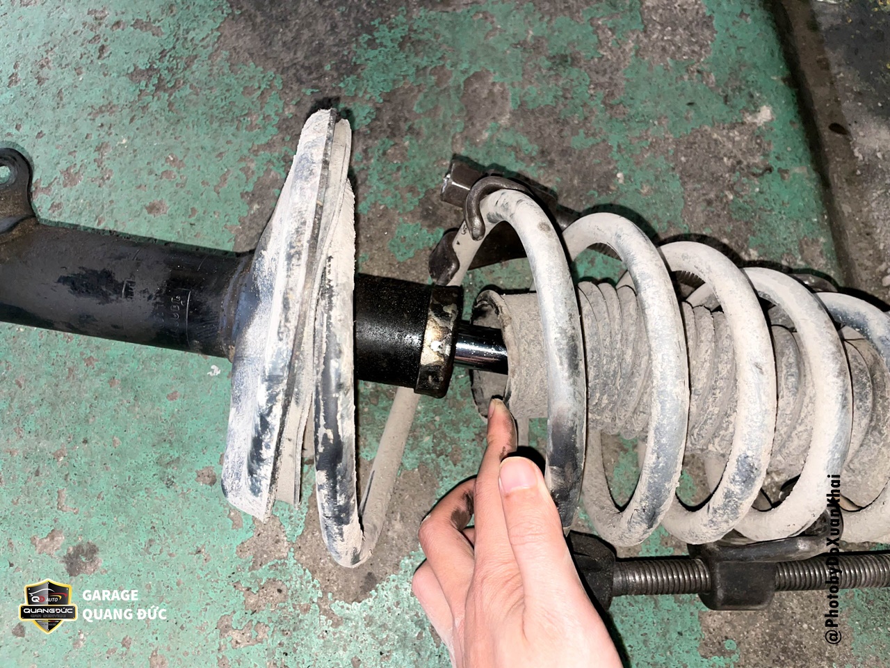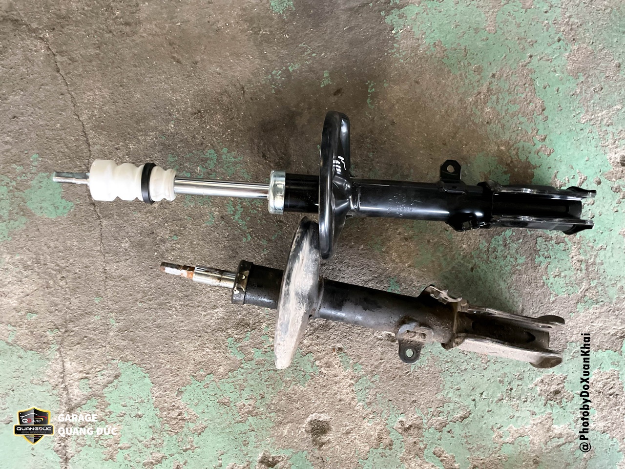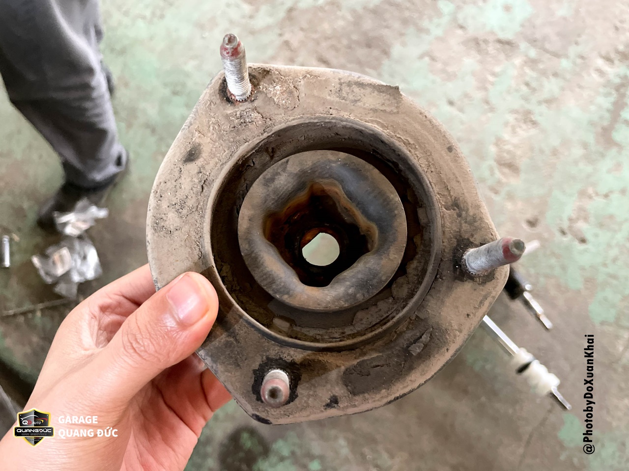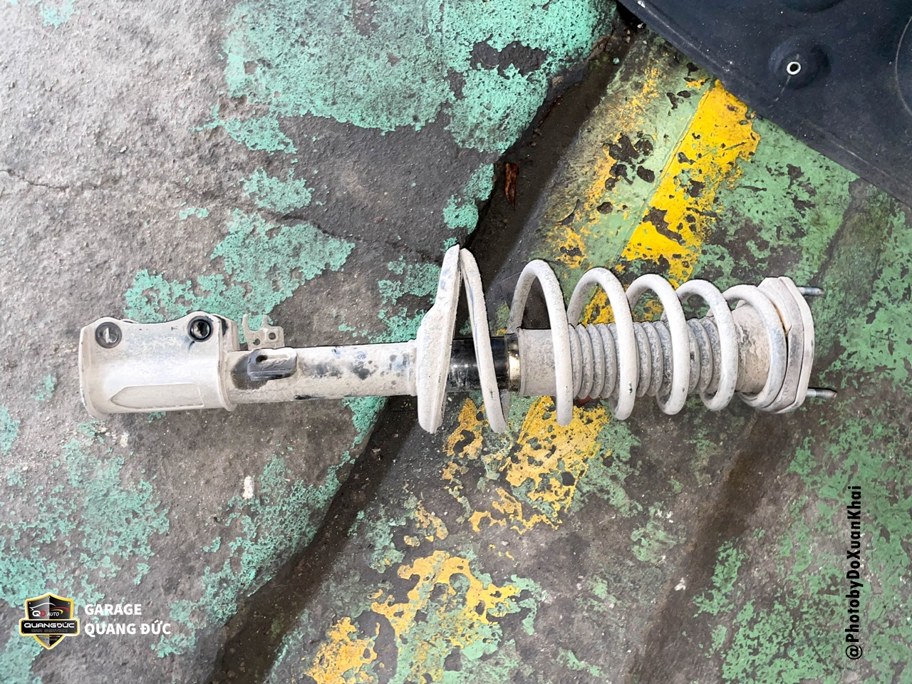 Sau 15 năm sử dụng đi được hơn 29 vạn, chiếc TOYOTA COROLLA CAMRY đã có biểu hiện kém đi ở hệ thống giảm xóc trước khiến xe bị nhún mạnh về phía trước khi phanh, xe bị lắc lư, lốp mòn không đều. Người ngồi trên xe không còn thấy sự êm ái khi đi qua gờ giảm tốc hoặc những chỗ xóc do hành trình giảm chấn đã kém. Trên lý thuyết, con số lý tưởng để người lái xe tiến hành kiểm tra, thay thế bộ giảm xóc ô tô là từ 80.000 - 140.000km tùy vào loại xe và điều kiện vận hành thường xuyên. Với các hiện tượng trên, đội ngũ kỹ thuật đã tiến hành thay thế ống giảm chấn trước ở cả hai bên trái phải. Do hệ thống treo đã bị ẩm dầu, dập nát tăm bông, hư hỏng bát bèo ( hình ảnh mô tả bên dưới).