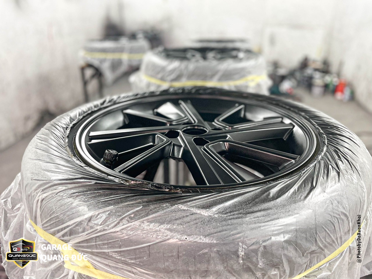 Bước 5: Bắt đầu sơn màu đen cho lazang: Sơn 2 lớp đến 3 lớp và phải đảm bảo phun tơi và đồng đều. Sấy khô sơn đen và tiếp tục che chắn tạo đường sơn chỉ đỏ