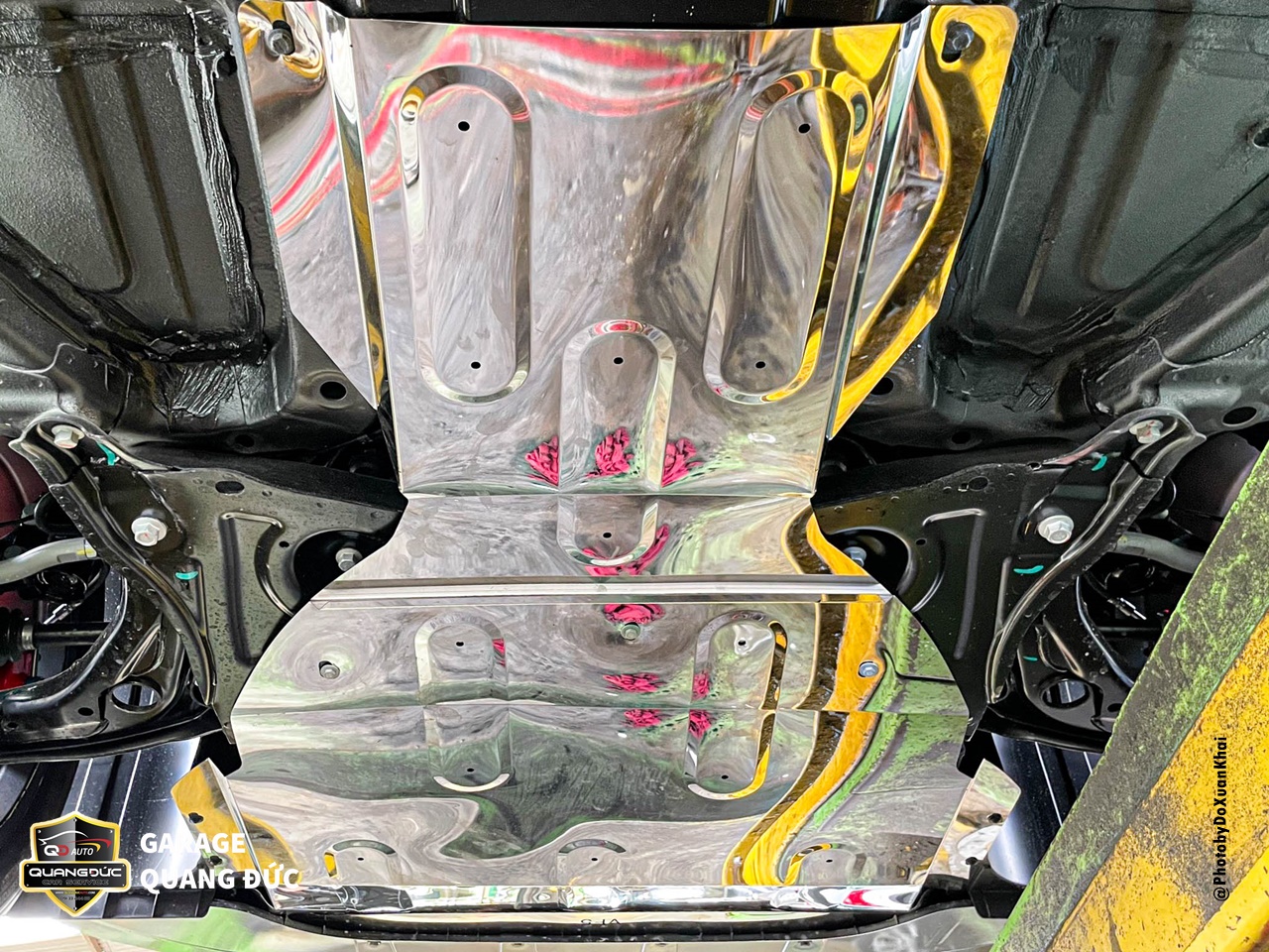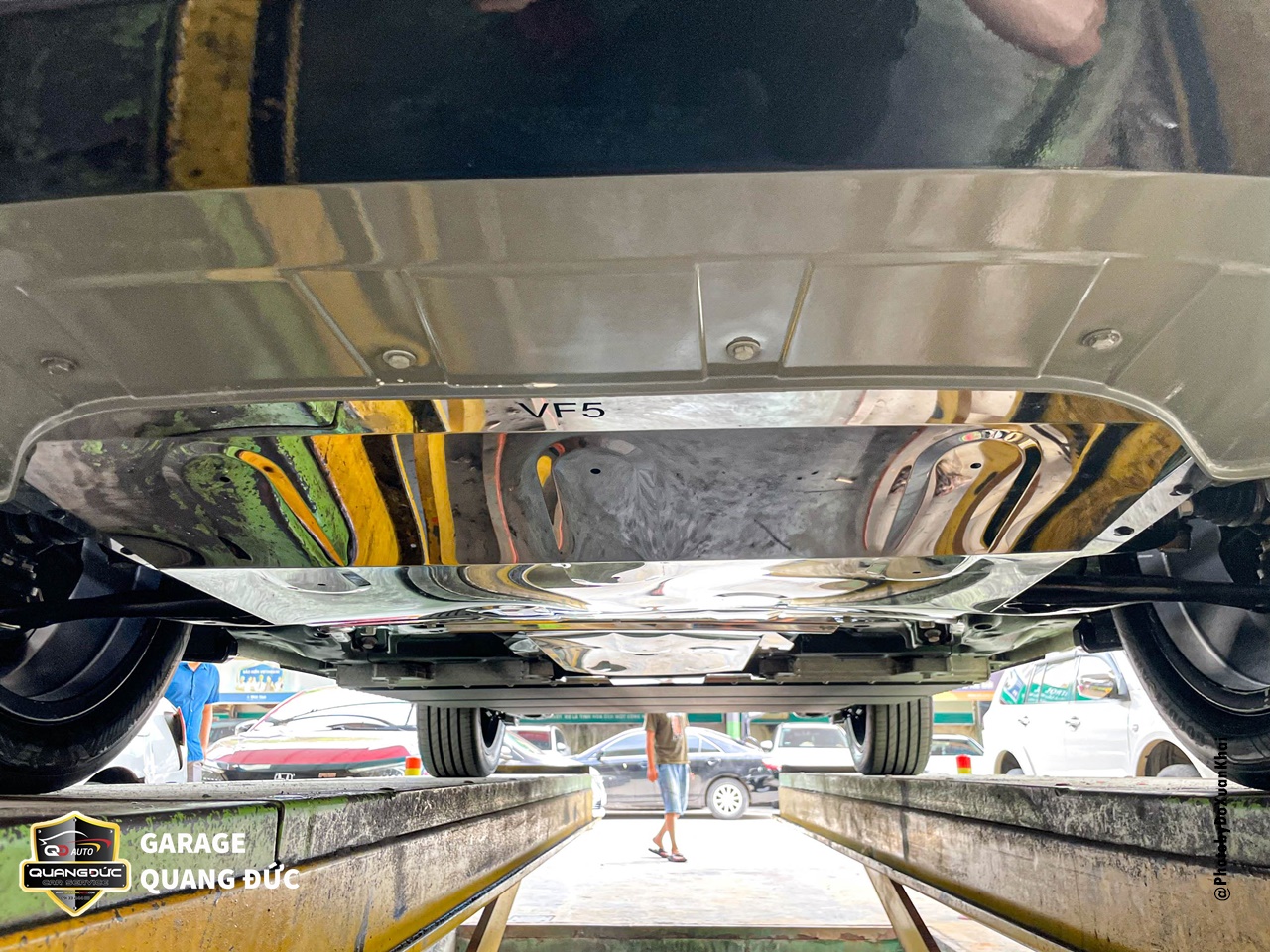 Mặc dù đã sơn phủ gầm nhưng chủ xe vẫn rất cẩn thận khi lựa chọn bảo vệ gầm, pin của VF5 bằng một tấm chắn gầm bằng inox chuyên dụng, có mã dành riêng cho chiếc xe này.