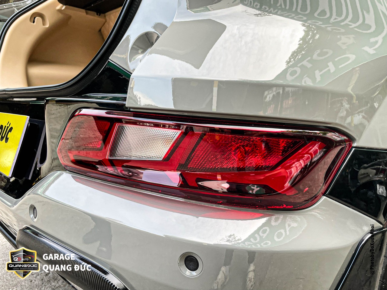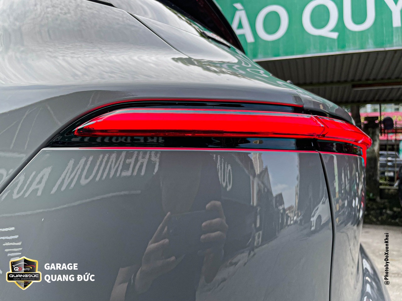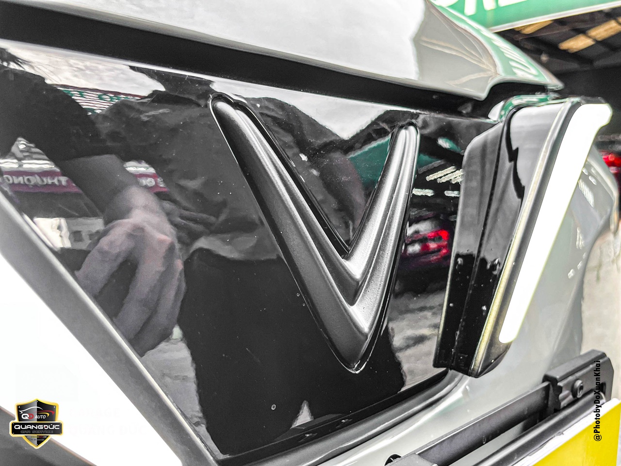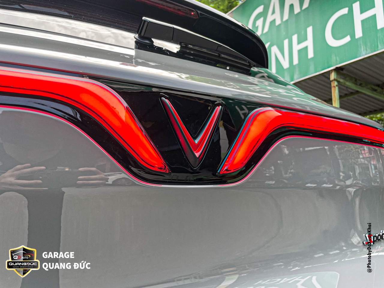 Tương tự như nắp capo phần nắp cốp cũng được tháo rời để sơn lại toàn bộ, tuy nhiên điểm nhấn nổi bật trên vị trí này là logo chữ V của “Vinfast” được sơn đỏ, tạo nên sự liền mạch phía đuôi xe khi kết hợp cũng các dải đèn led hai bên.