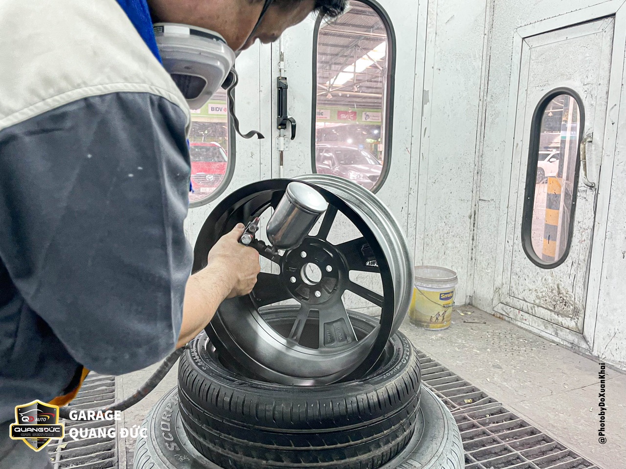 Bước 5: Bắt đầu sơn màu đen cho lazang: Sơn 2 lớp đến 3 lớp và phải đảm bảo phun tơi và đồng đều. Sấy khô sơn đen và tiếp tục che chắn tạo đường sơn chỉ đỏ