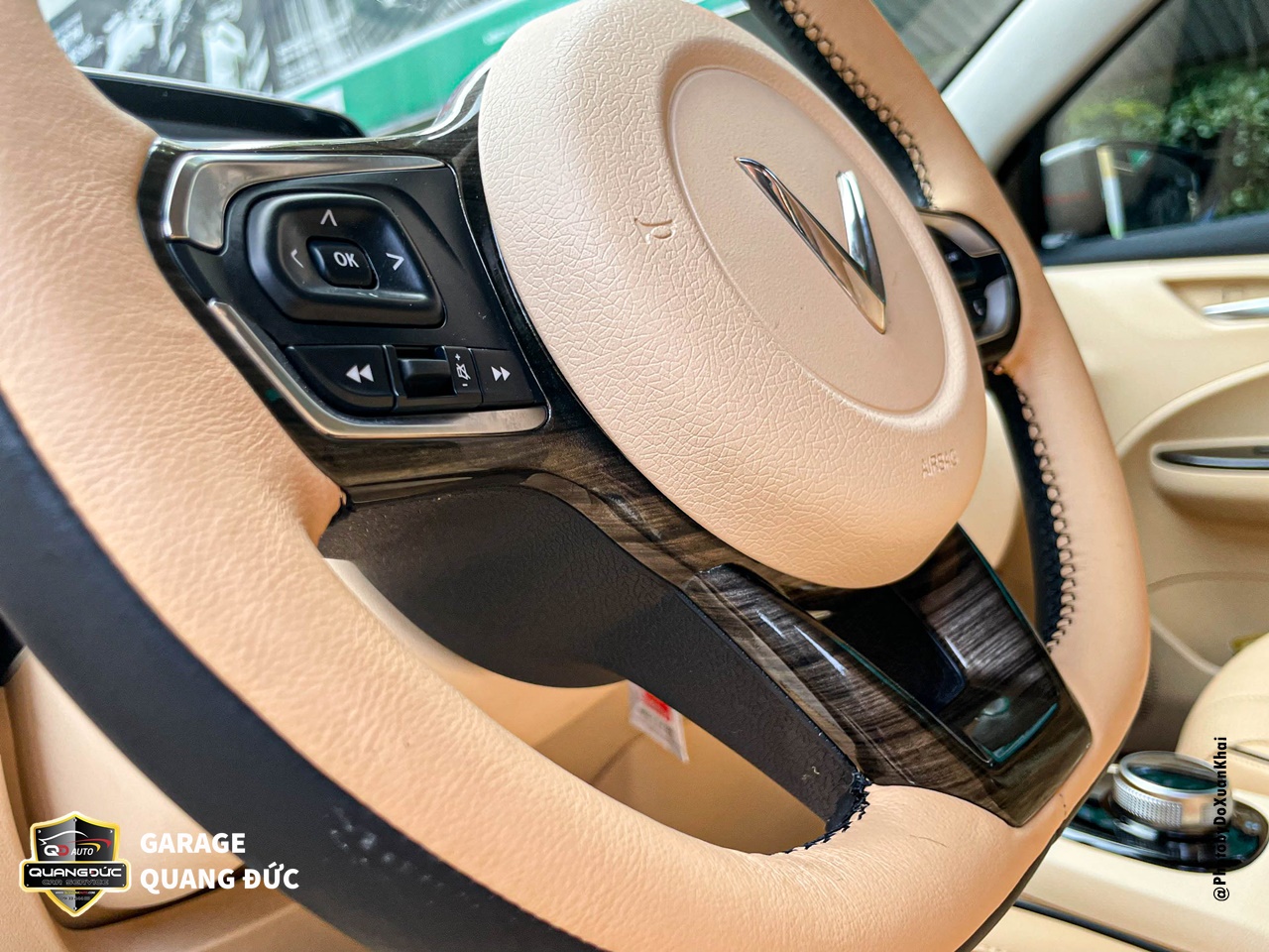Ngoài hai hàng ghế, còn chi tiết đặc biệt nữa đó chính là Volang cũng đã được nâng cấp. Để tiết kiệm chi phí, nhà sản xuất đã làm volang bằng nhựa mềm không bọc, do đó Quang Đức Auto đã thiết kế bọc da Nappa khâu lại với hai màu kem ( chủ đạo) & màu đen nhám, bên cạnh đó điểm thêm là các chi tiết nhựa ở ba chấu ( trước đây chỉ là nhựa thường). Tất cả những thay đổi đó đã làm cho các chi tiết trở nên nổi bật, tôn thêm vẻ sang trọng, sáng mịn cho khoang nội thất.