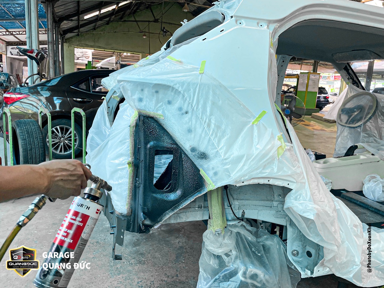 Bước 5: Chuẩn bị bề mặt và che phủ các vùng không cần sơn, sau đó sơn lớp sơn lót. Lớp sơn lót này che phủ bả matit và sơn chống gỉ, cũng như làm cho lớp sơn chính đạt màu sắc và bóng đẹp hơn. Sau khi sơn lót, thực hiện việc sấy khô và đánh nhám lớp sơn lót để tăng độ bám dính cho lớp sơn chính.