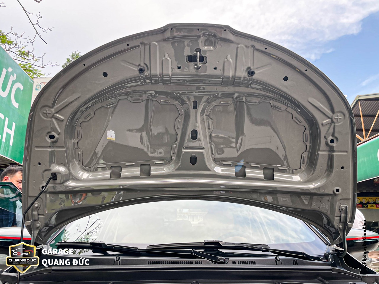 Nắp capo được tháo rời và phun sơn toàn bộ các bề mặt là màu xám xi măng đồng bộ với màu chủ đạo của xe.