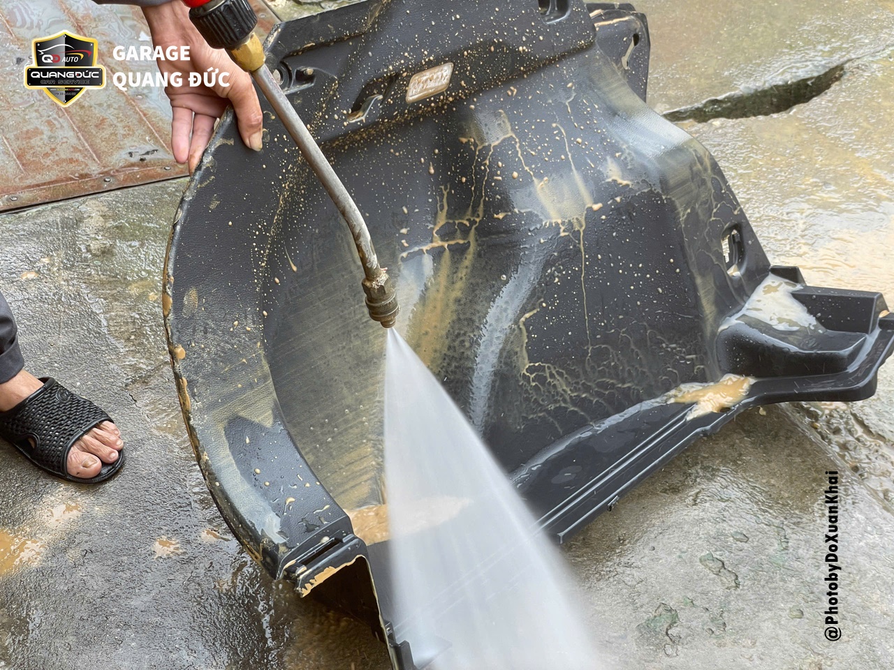 Bước 3: Xịt rửa bùn đất bám dính toàn bộ nội thất, ngoại thất, khoang động cơ xe ngập nước